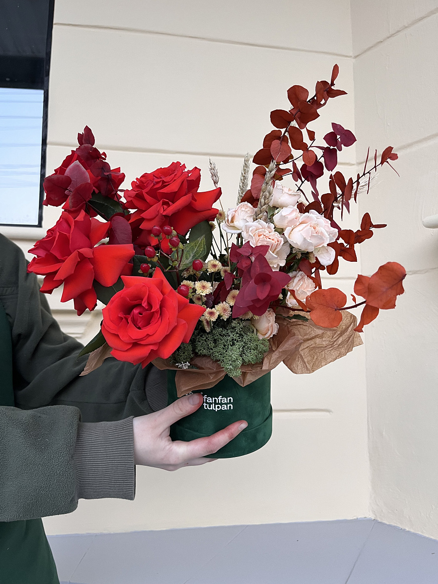 Данная цветочная композиция под запрос. Это значит что возможно у нас отсутствует какой-либо цветок в составе букета. Но мы готовы собрать похожую композицию, не чуть не менее красивую чем эта. Вы можете оставить заявку. И мы свяжемся с вами и предложим возможные варианты.