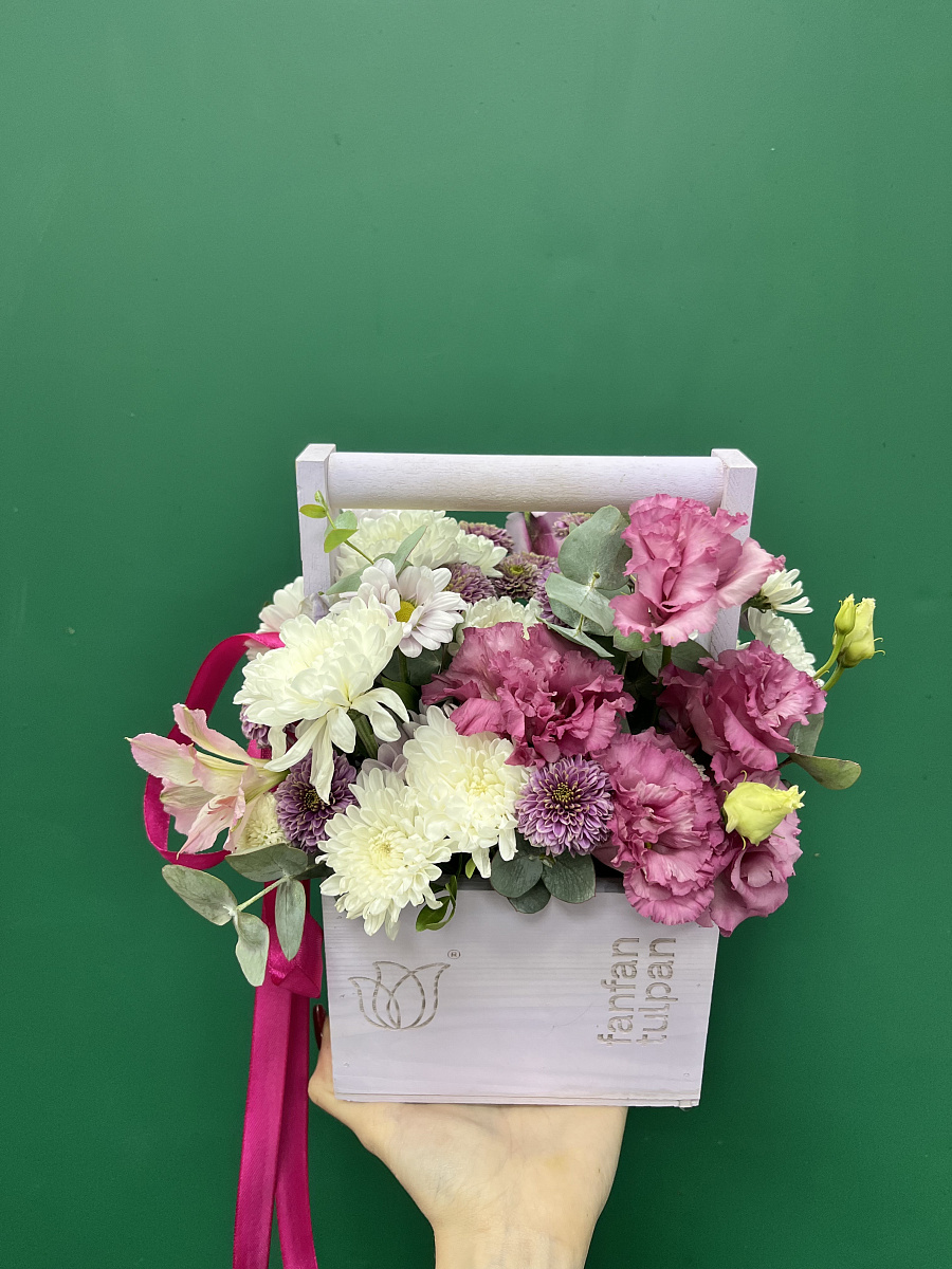 Данная цветочная композиция под запрос. Это значит что возможно у нас отсутствует какой-либо цветок в составе букета. Но мы готовы собрать похожую композицию, не чуть не менее красивую чем эта. Вы можете оставить заявку. И мы свяжемся с вами и предложим возможные варианты.