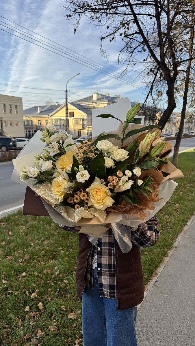 Данная цветочная композиция под запрос. Это значит что возможно у нас отсутствует какой-либо цветок в составе букета. Но мы готовы собрать похожую композицию, не чуть не менее красивую чем эта. Вы можете оставить заявку. И мы свяжемся с вами и предложим возможные варианты.