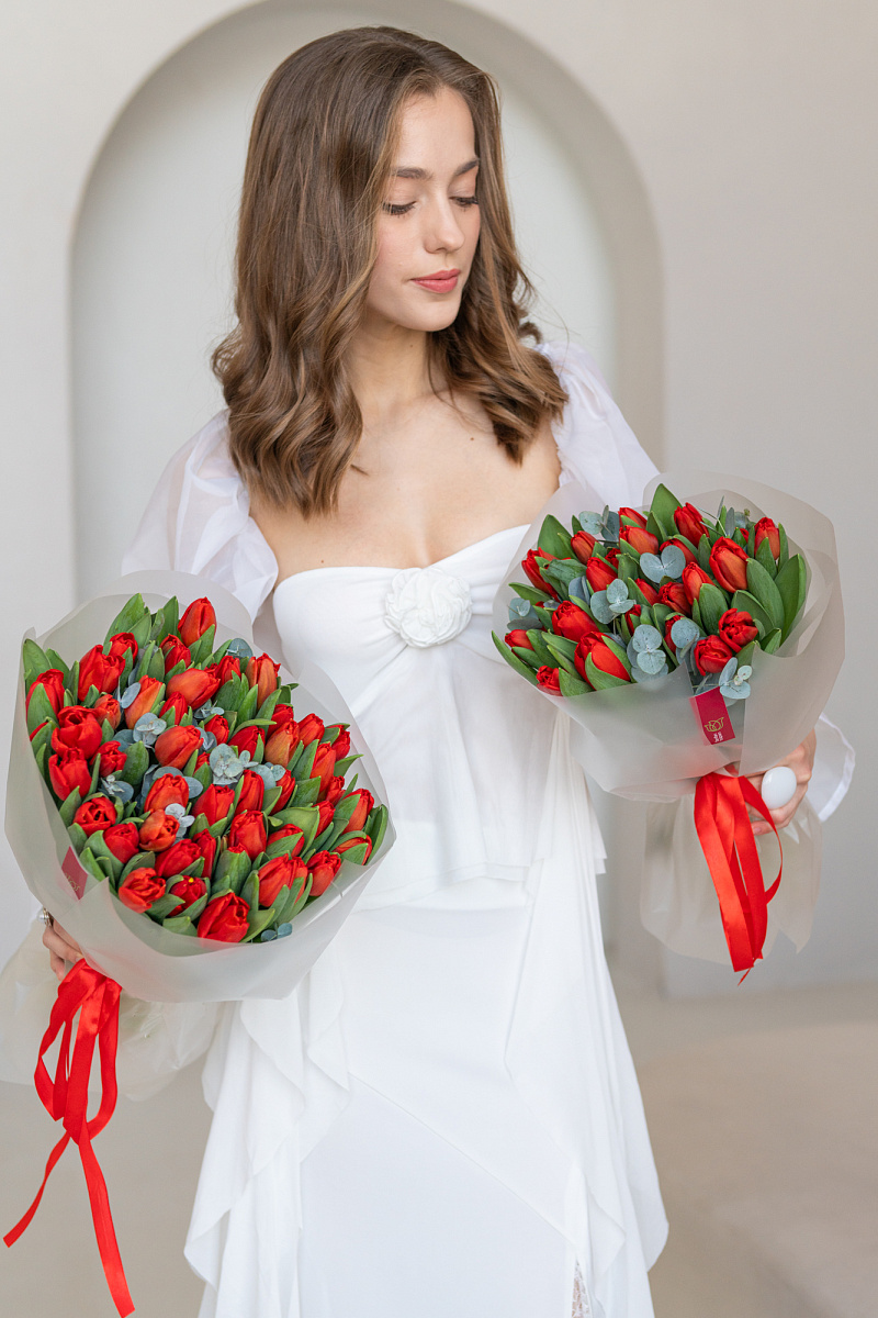 Модная комбинация: яркие красные тюльпаны и лаконичный эвкалипт. Минималистичная геометрия бутонов и мягкая фактура зелени создают актуальный визуальный дуэт. Такой букет станет выразительным акцентом в современном пространстве или стильным знаком внимания без лишних слов.