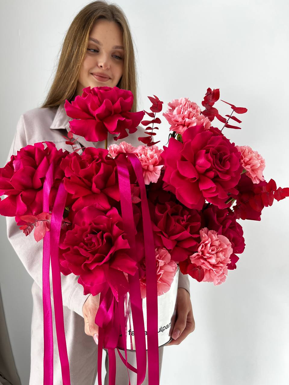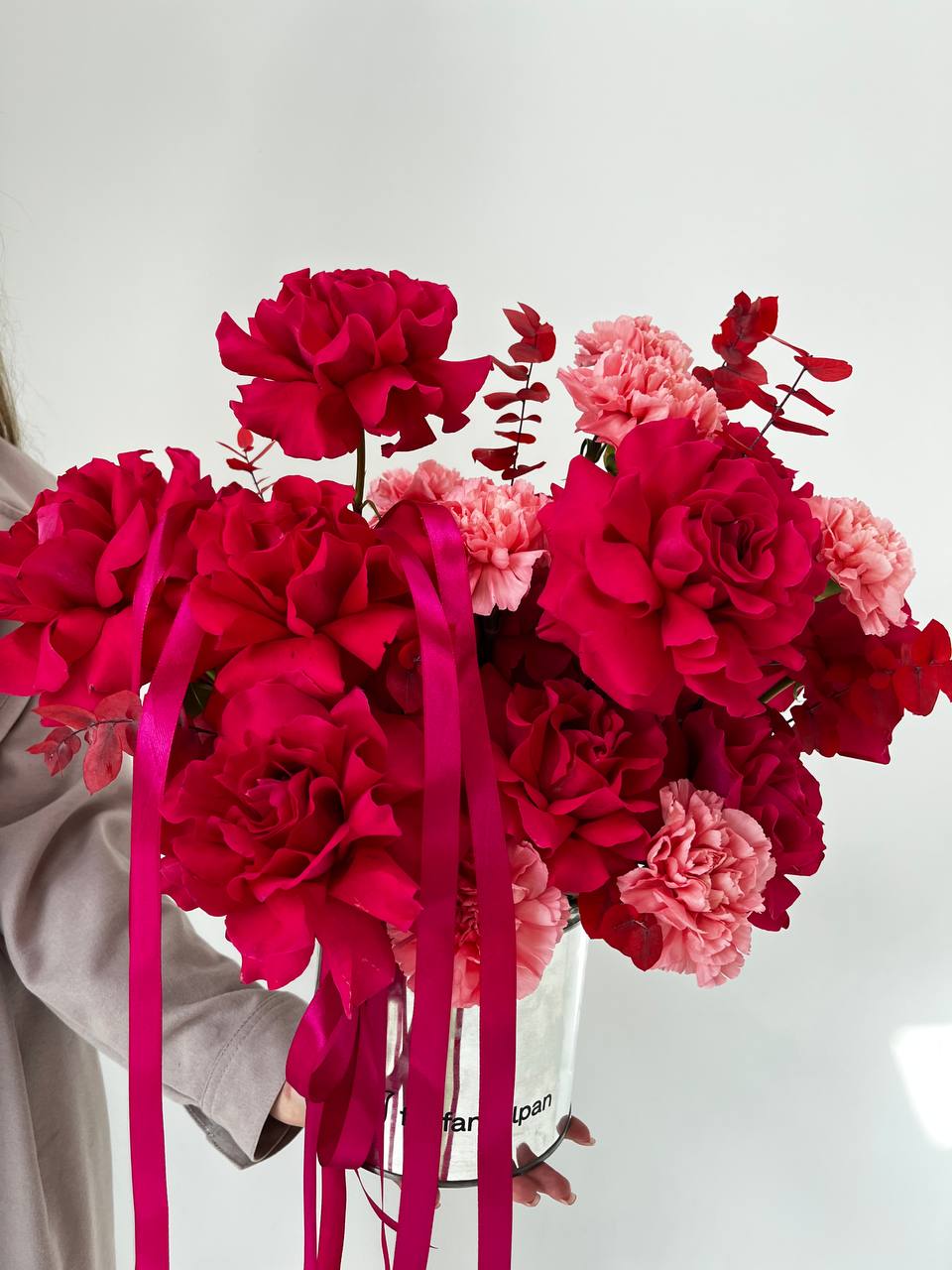 Букет из ярких роз и гвоздик — символ страсти и взаимопонимания, идеальный для романтических моментов.