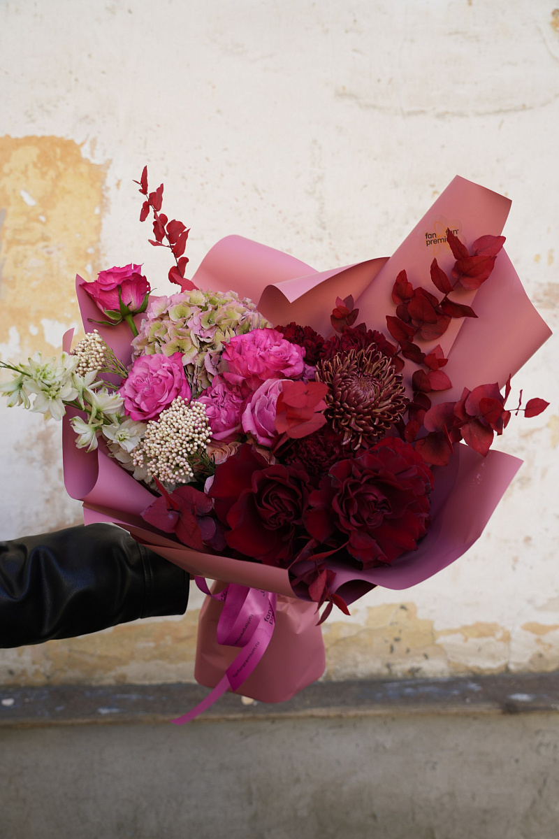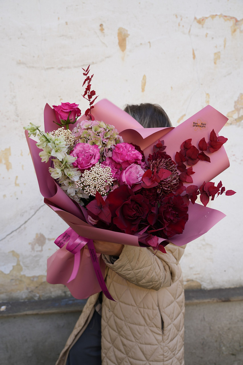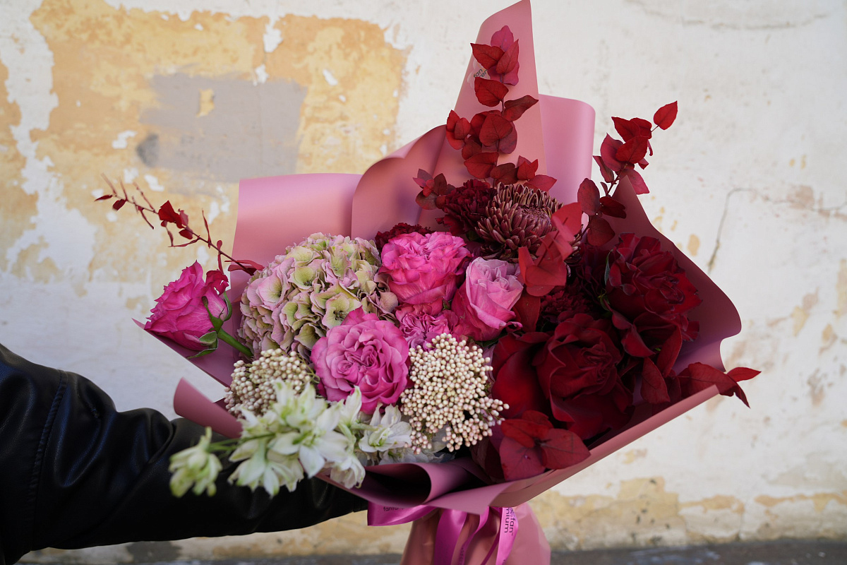 Розы ,Дельфиниум ,Хризантема одноголовая ,Гортензия ,Эвкалипт стабилизированный