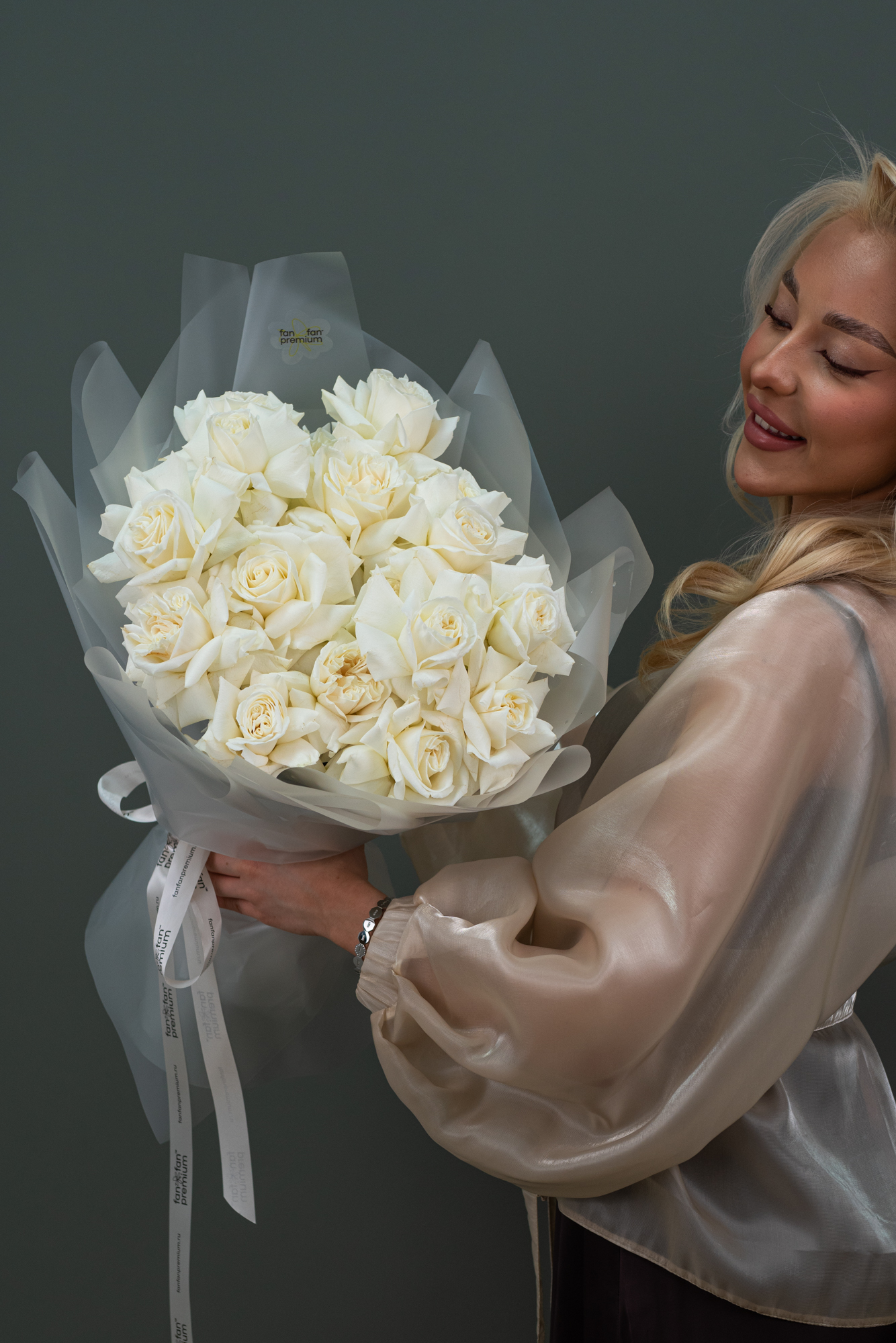 Букет транспортируется с Аквабоксе и Коробке-Трапеции, либо в Аквабоксе и Фирменном пакете.
