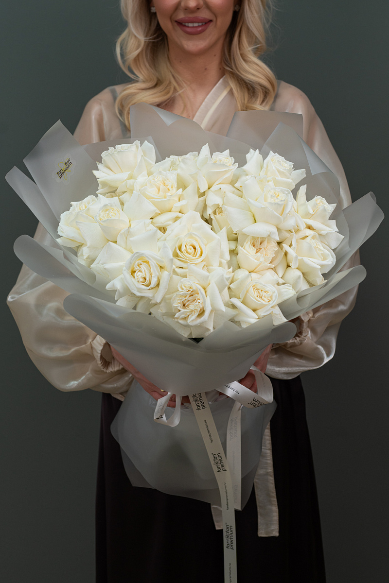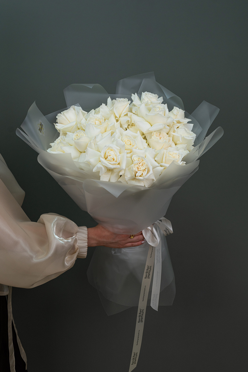 Данный букет составлен из 25 безупречных белых роз сорта Playa Blanca, обладающих ярким контрастом идеальной формы цветка и снежно-белой окраски лепестков. Аромат мягких роз наполнен тонким цитрусовым шлейфом, подчеркивая атмосферу чистоты и свежести.