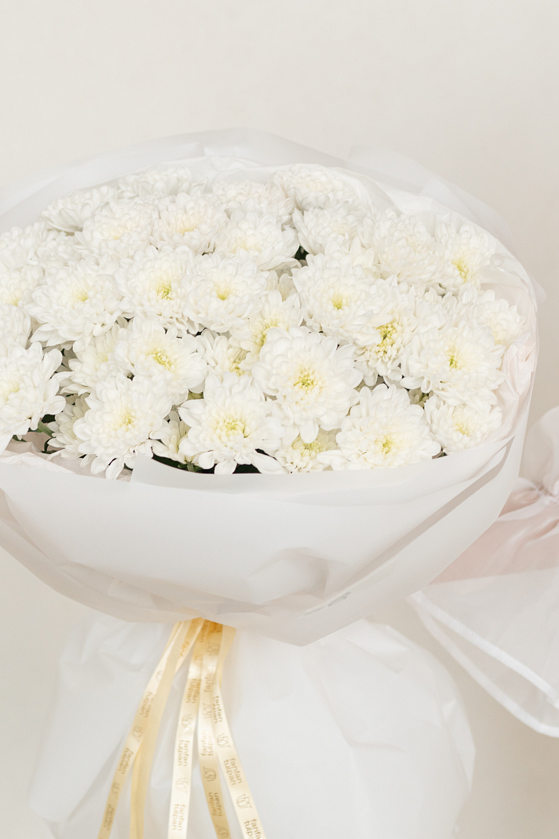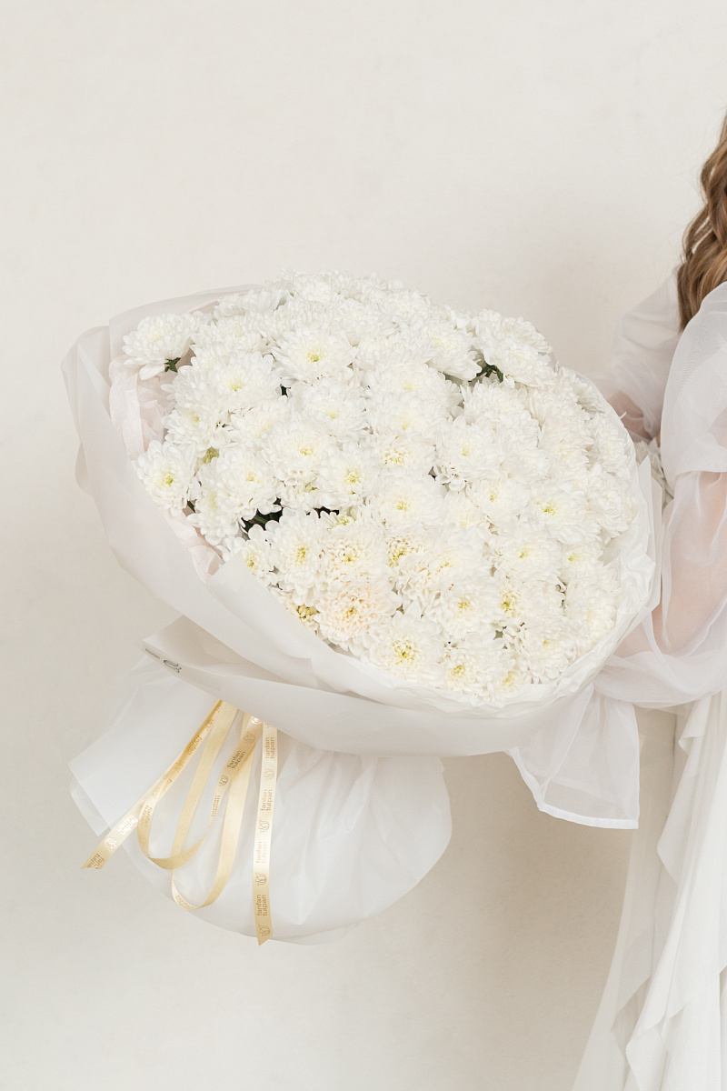 Букет из белых хризантем — как несказанное признание в искренних чувствах. Каждый цветок словно шепчет о чистоте помыслов и глубине эмоций. Подарите этот символ нежности тому, кто занимает особое место в вашем сердце.