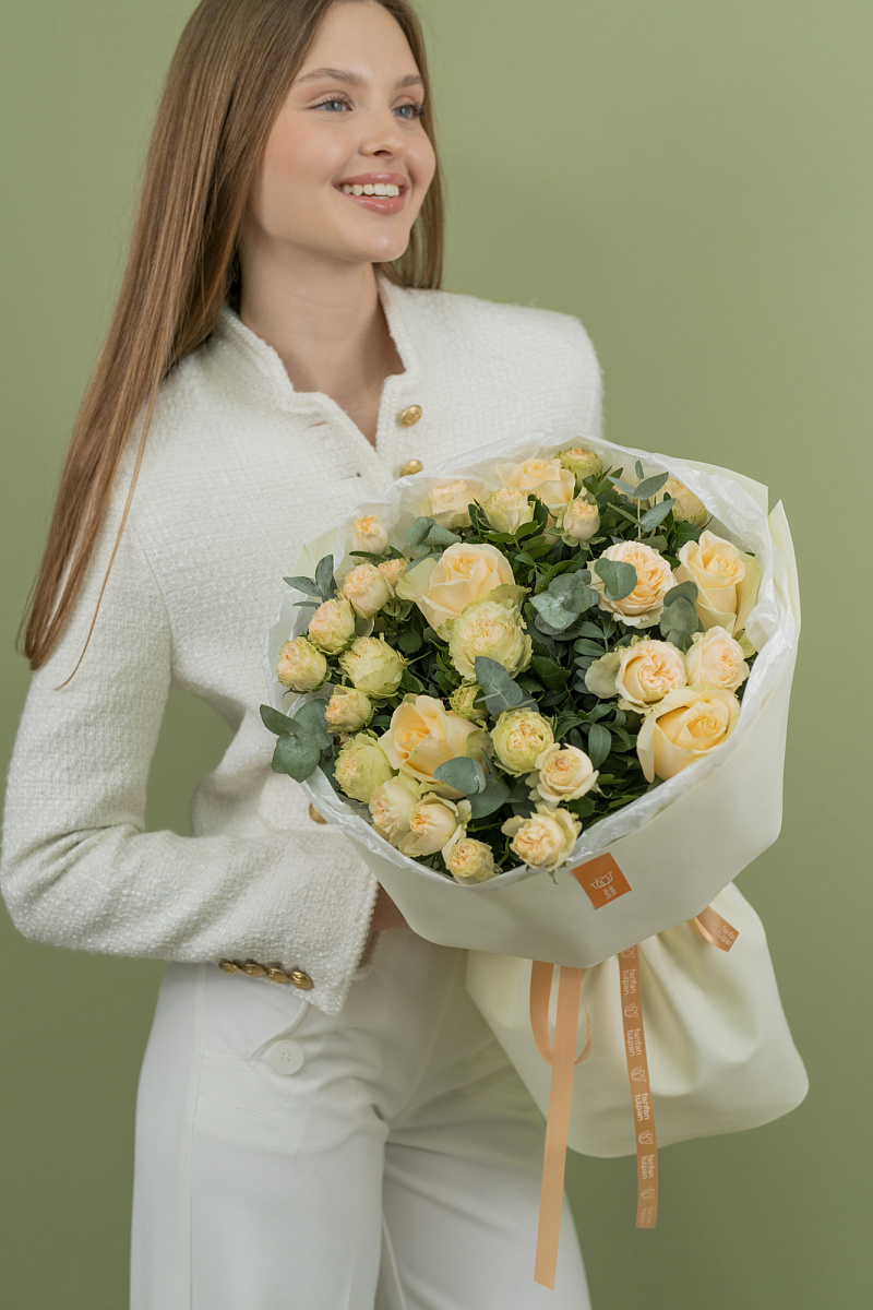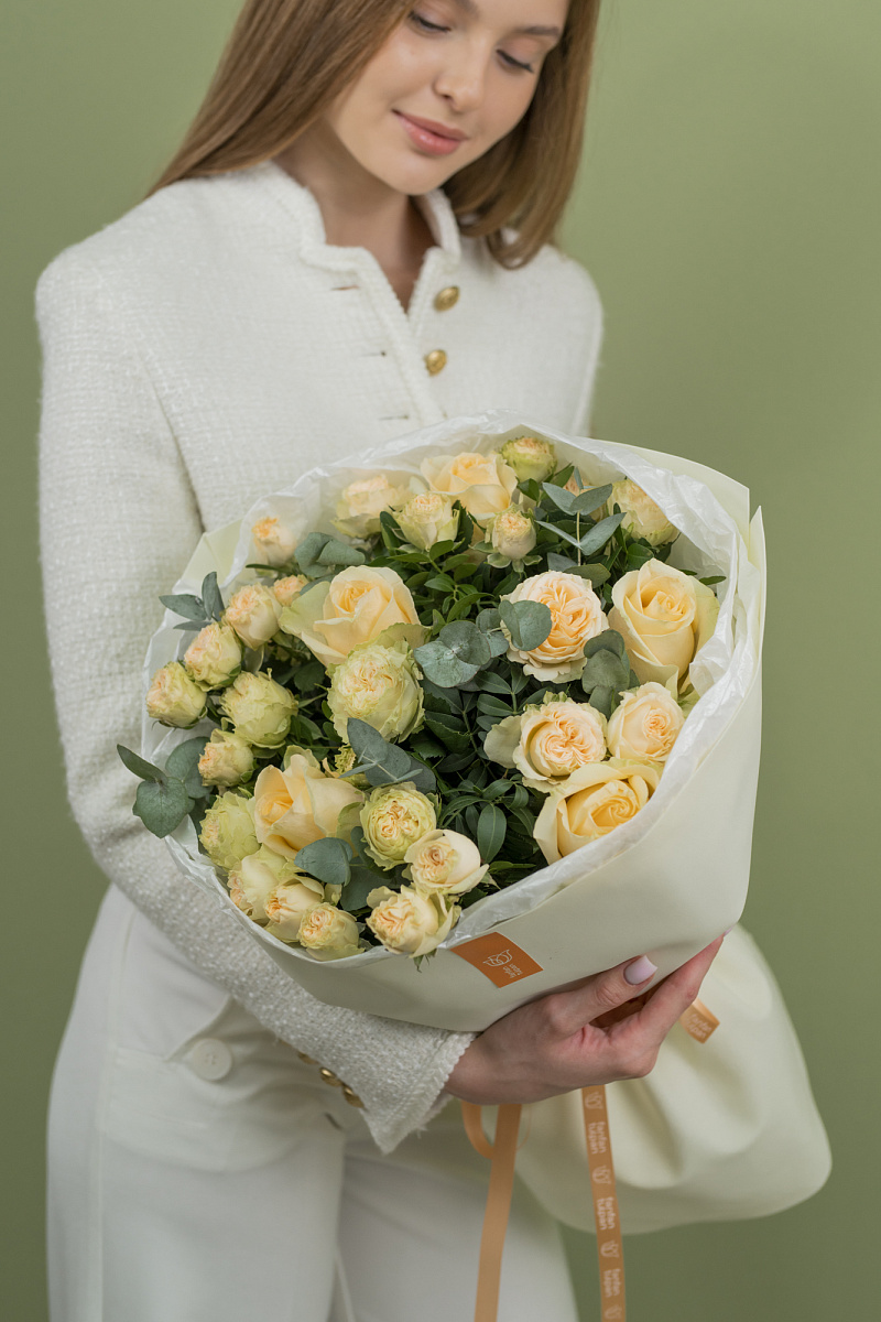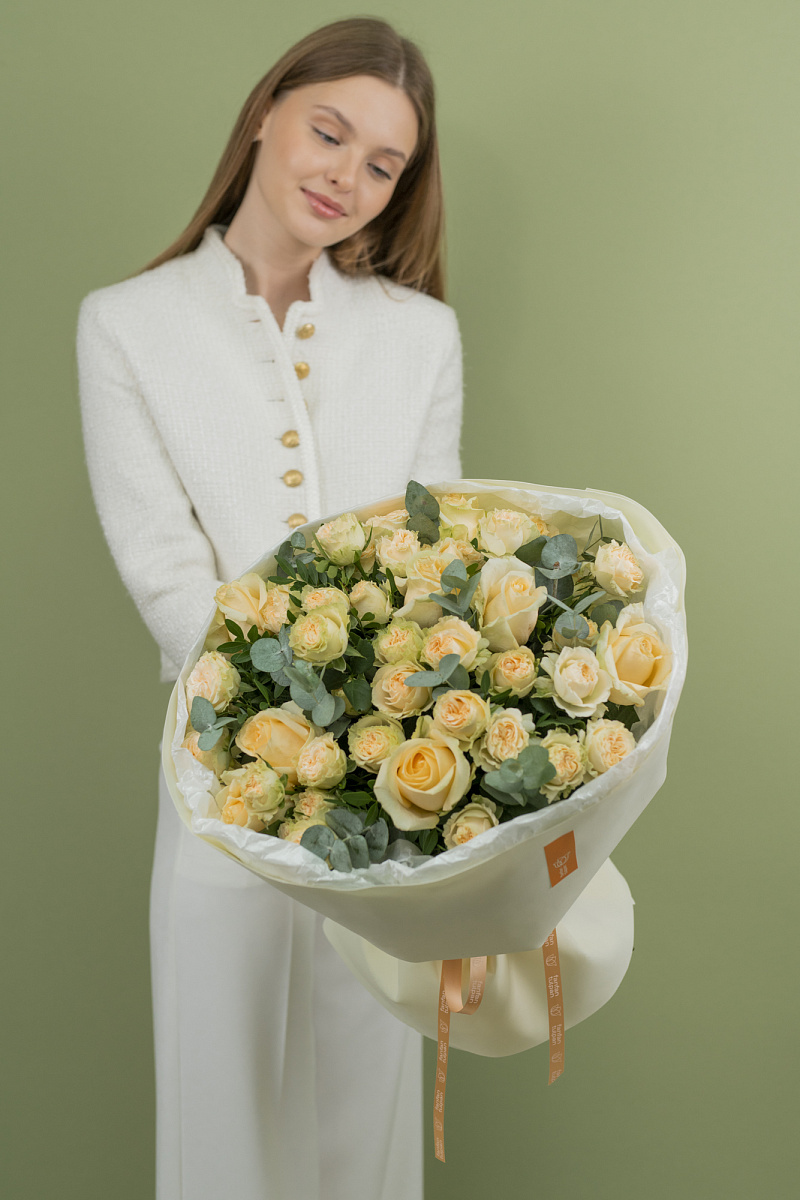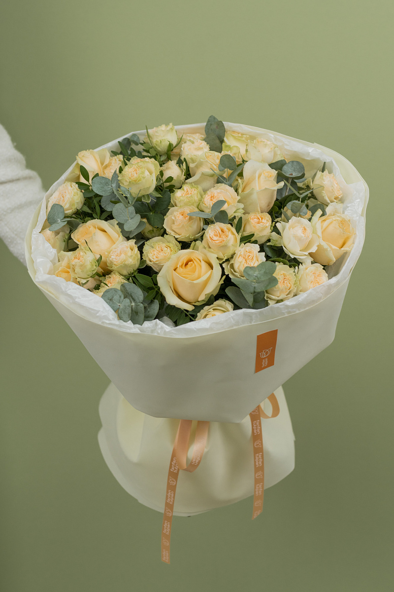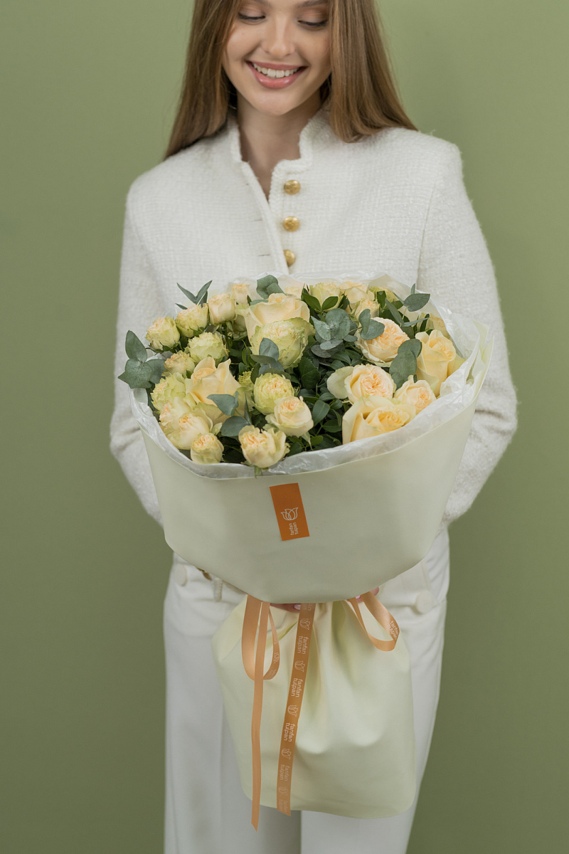 Этот букет из персиковых роз и персиковых кустовых роз станет истинным изумлением для каждого, кто окажется рядом с ним. Он вызывает неописуемые эмоции, погружая нас в волшебный мир роскоши и элегантности. Каждый цветок словно рассказывает свою уникальную историю, раскрывая перед нами тайны природы и ее бесконечных вдохновляющих возможностей.