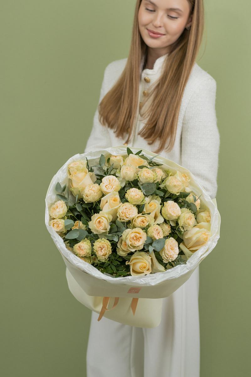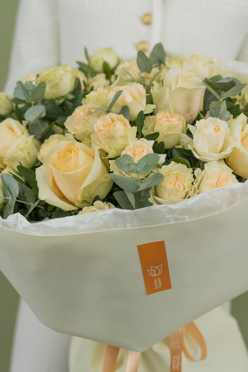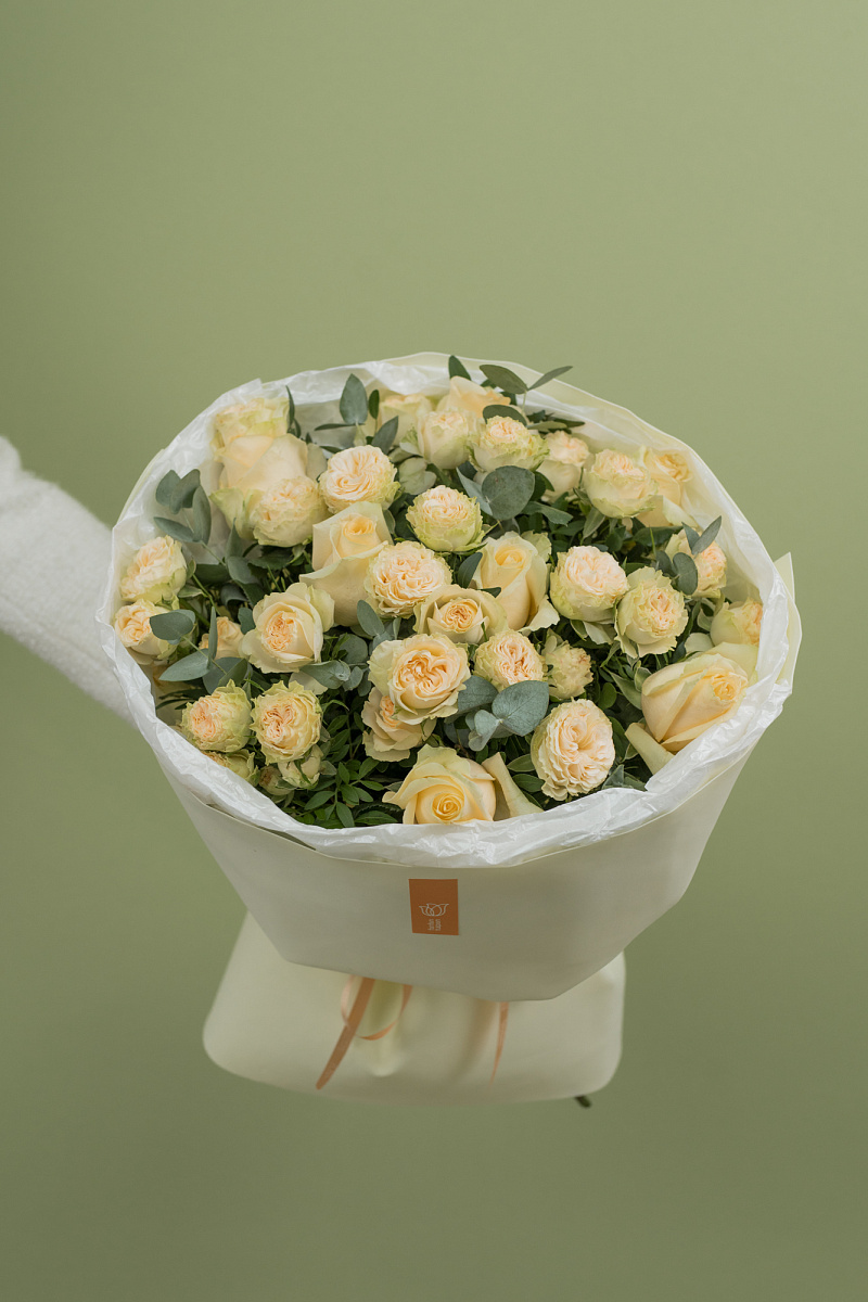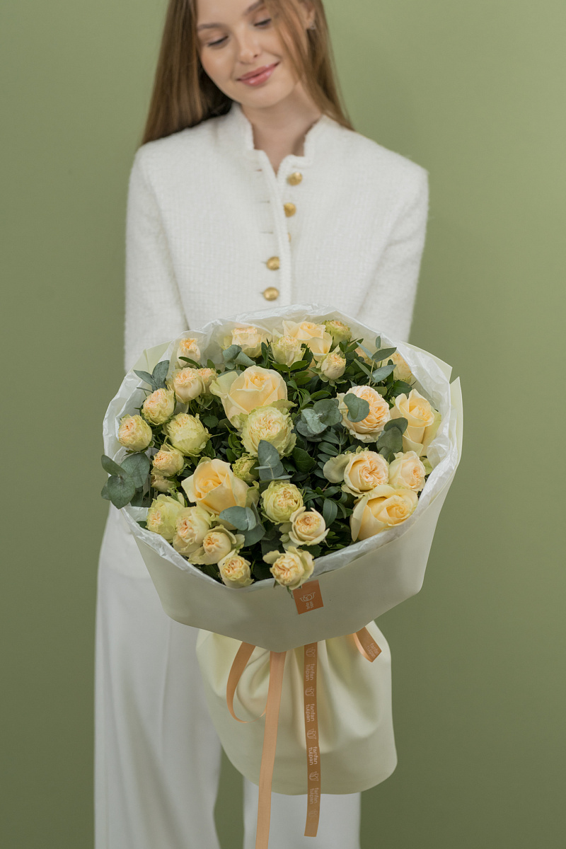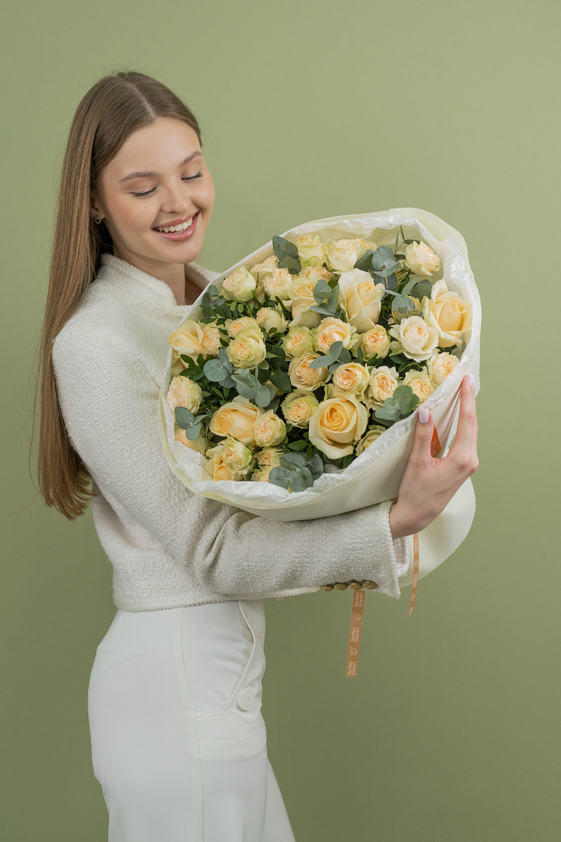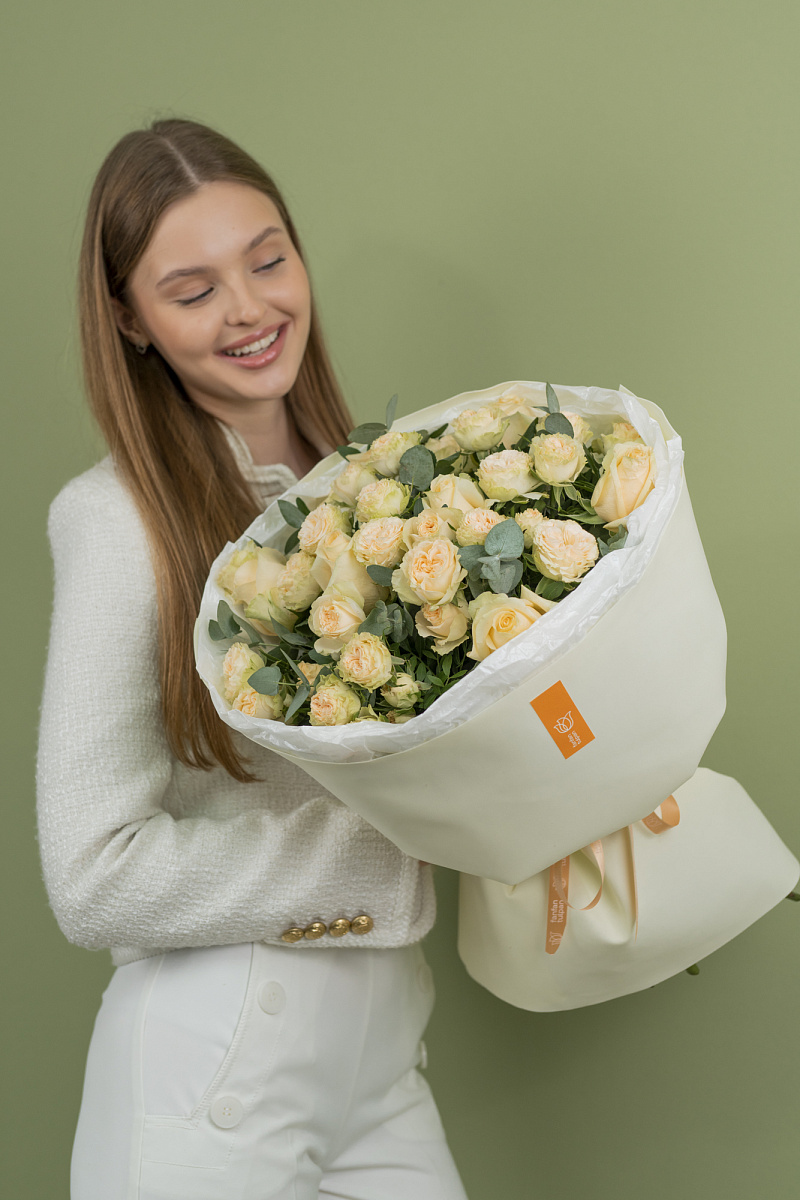 Этот букет из персиковых роз и персиковых кустовых роз станет истинным изумлением для каждого, кто окажется рядом с ним. Он вызывает неописуемые эмоции, погружая нас в волшебный мир роскоши и элегантности. Каждый цветок словно рассказывает свою уникальную историю, раскрывая перед нами тайны природы и ее бесконечных вдохновляющих возможностей.