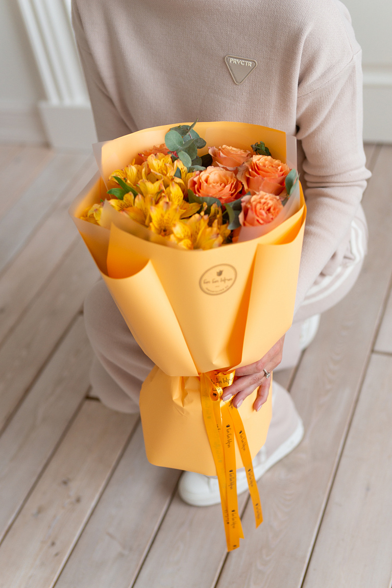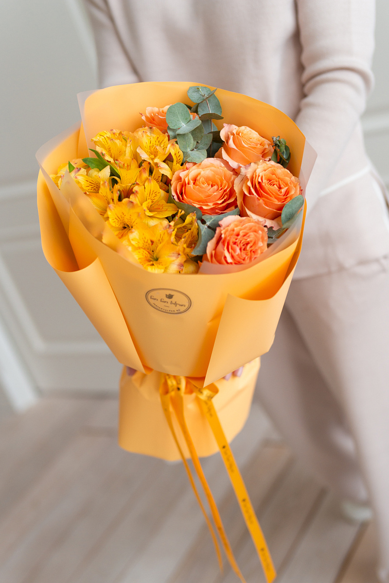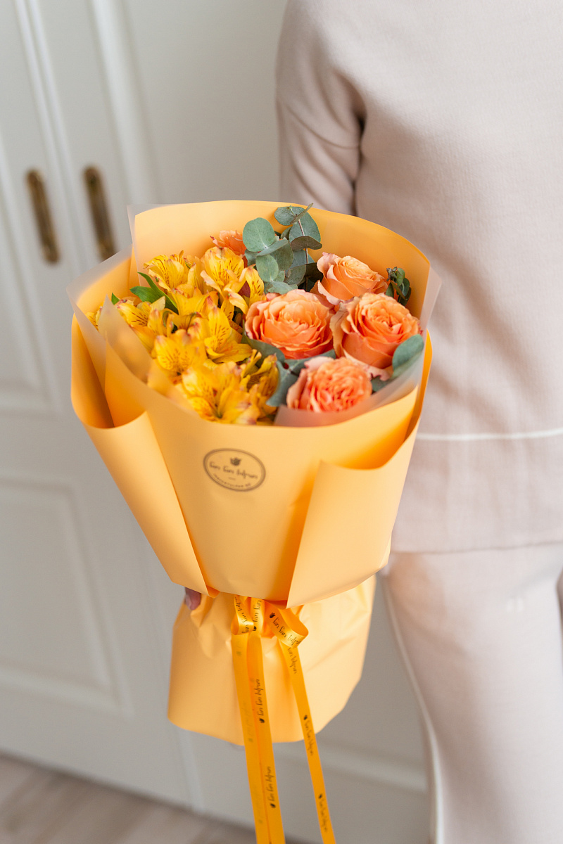 Букет с персиковыми розами и альстромерией — это истинное произведение искусства, источающее нежность и яркость. Персиковые розы, символизирующие гармонию и искренние чувства, словно обнимают альстромерии, которые добавляют композиции нотки экзотики и радости.