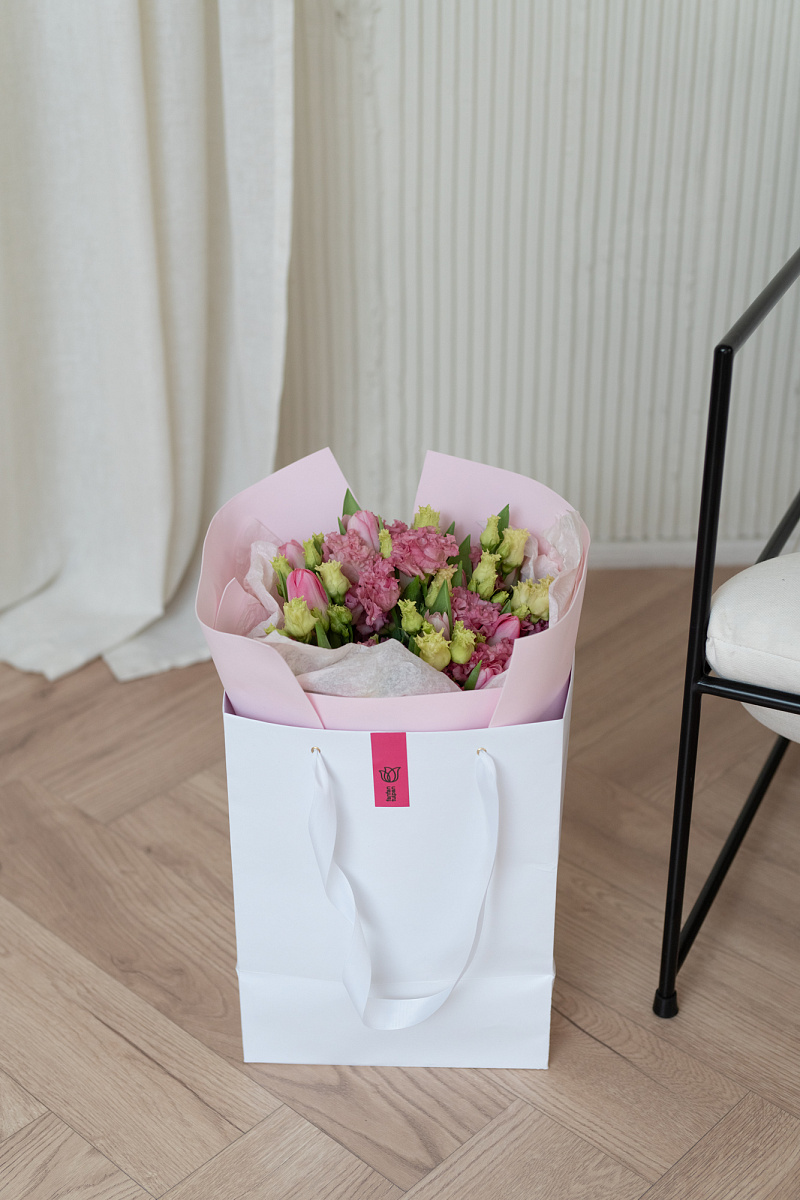 Букет доставляется в фирменном транспортировочном пакете.