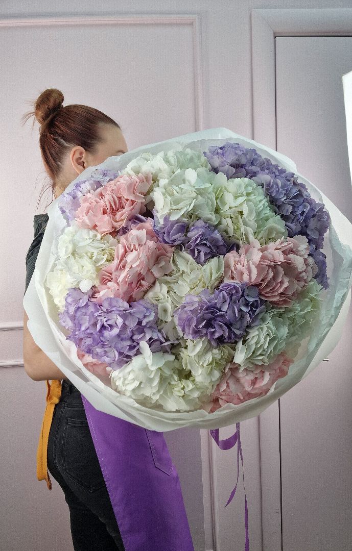 Букет-микс из гортензий — словно мгновение лета, застывшее в цветах. Нежные оттенки розового, голубого и белого переплетаются в гармоничной композиции, напоминая о закате над морем, утренней росе и первых весенних днях.