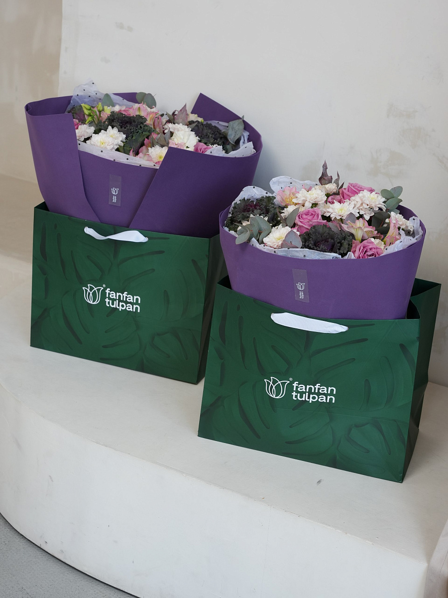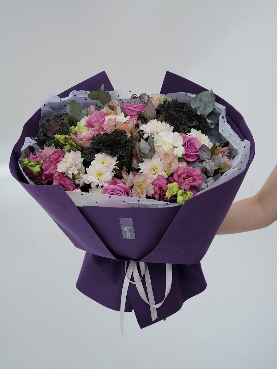 Представленный букет олицетворяет собой соединение природы и искусства. Его основной элемент — капуста брассика, чьи причудливые формы напоминают живописные облака, создаёт контраст и притягивает взгляд.