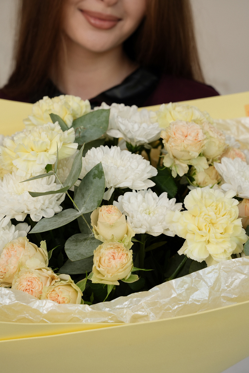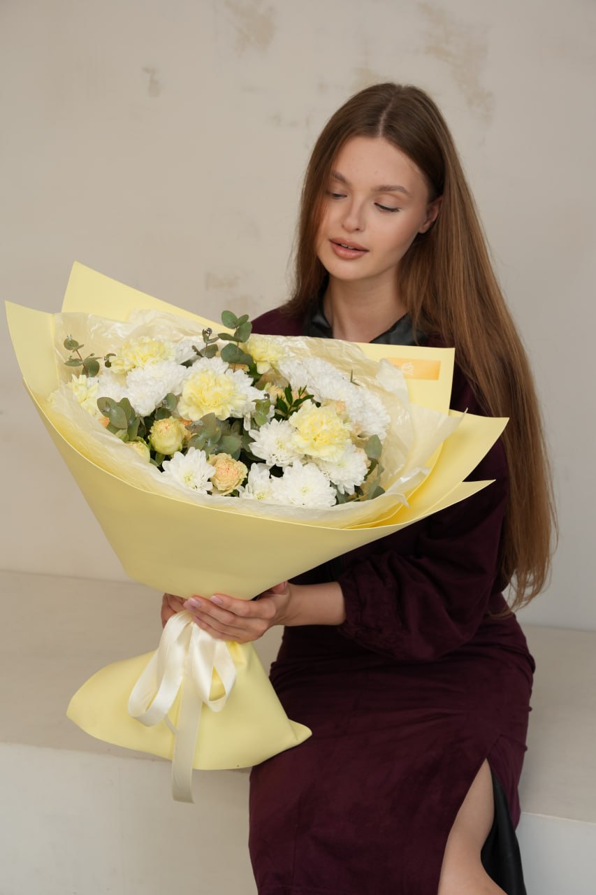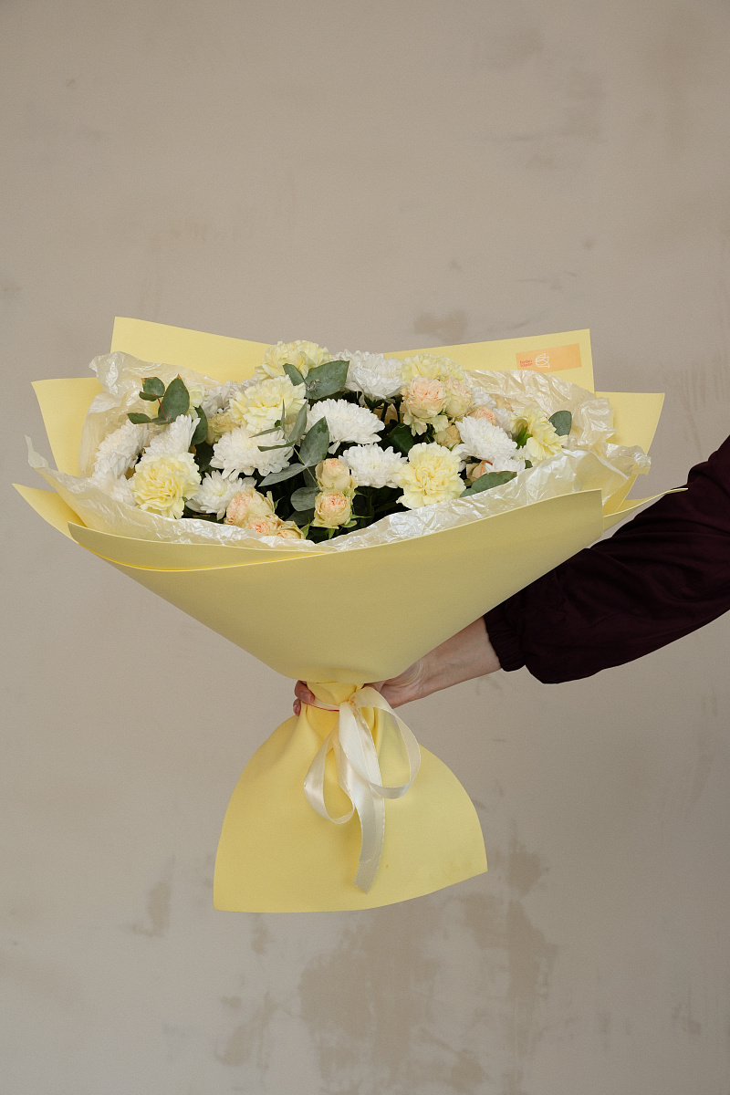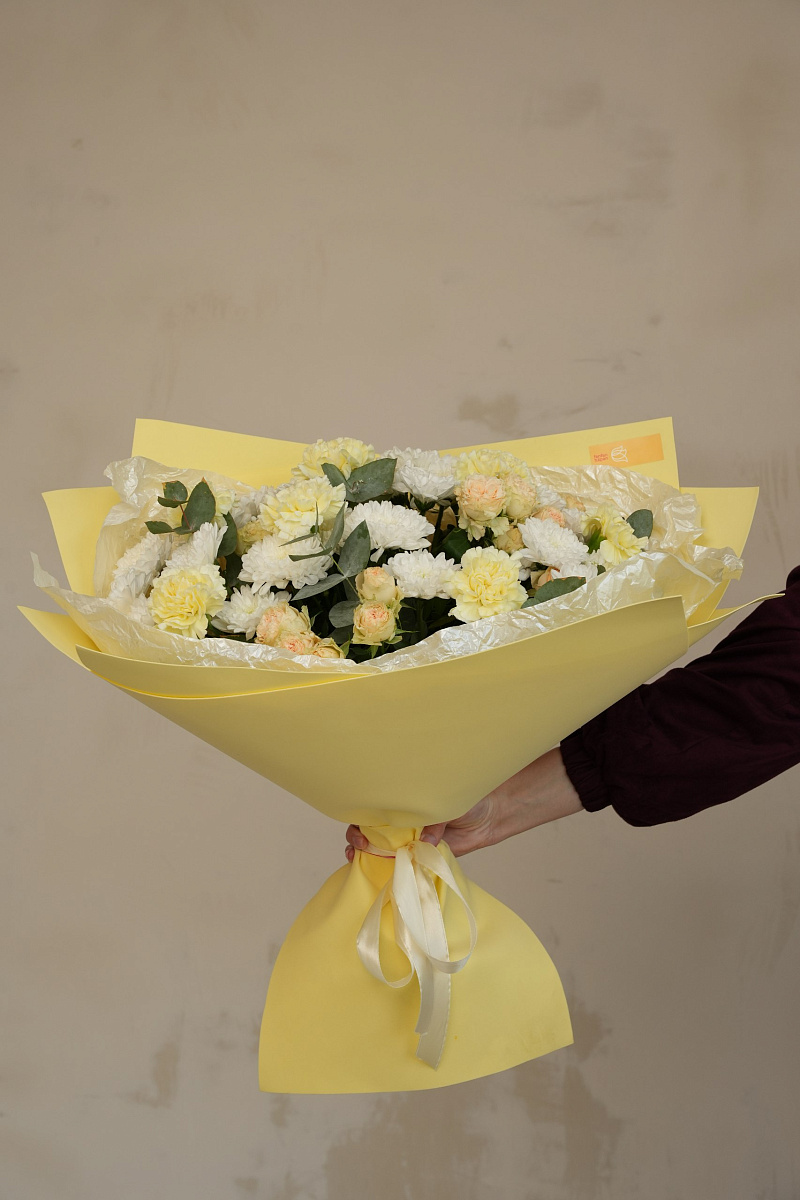 Букет с Хризантемой и лимонными гвоздиками Лунный мед