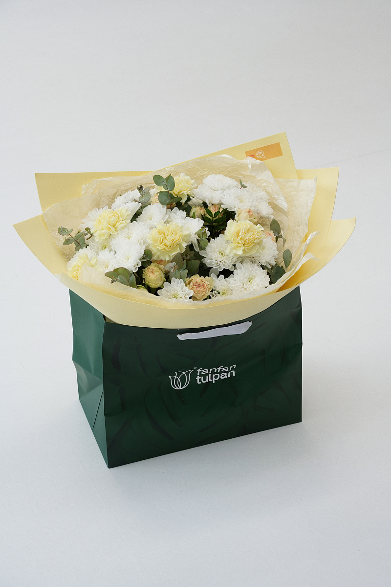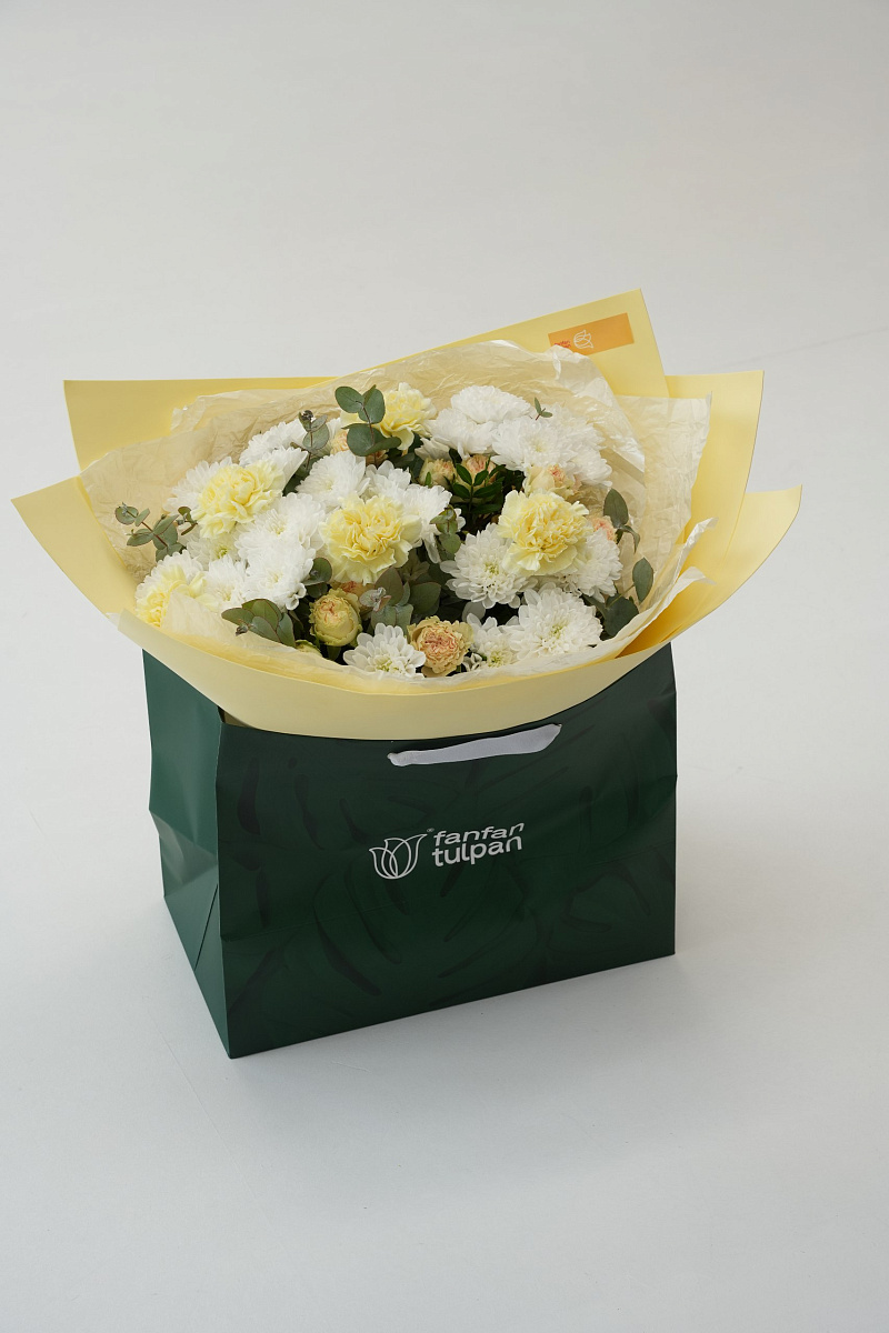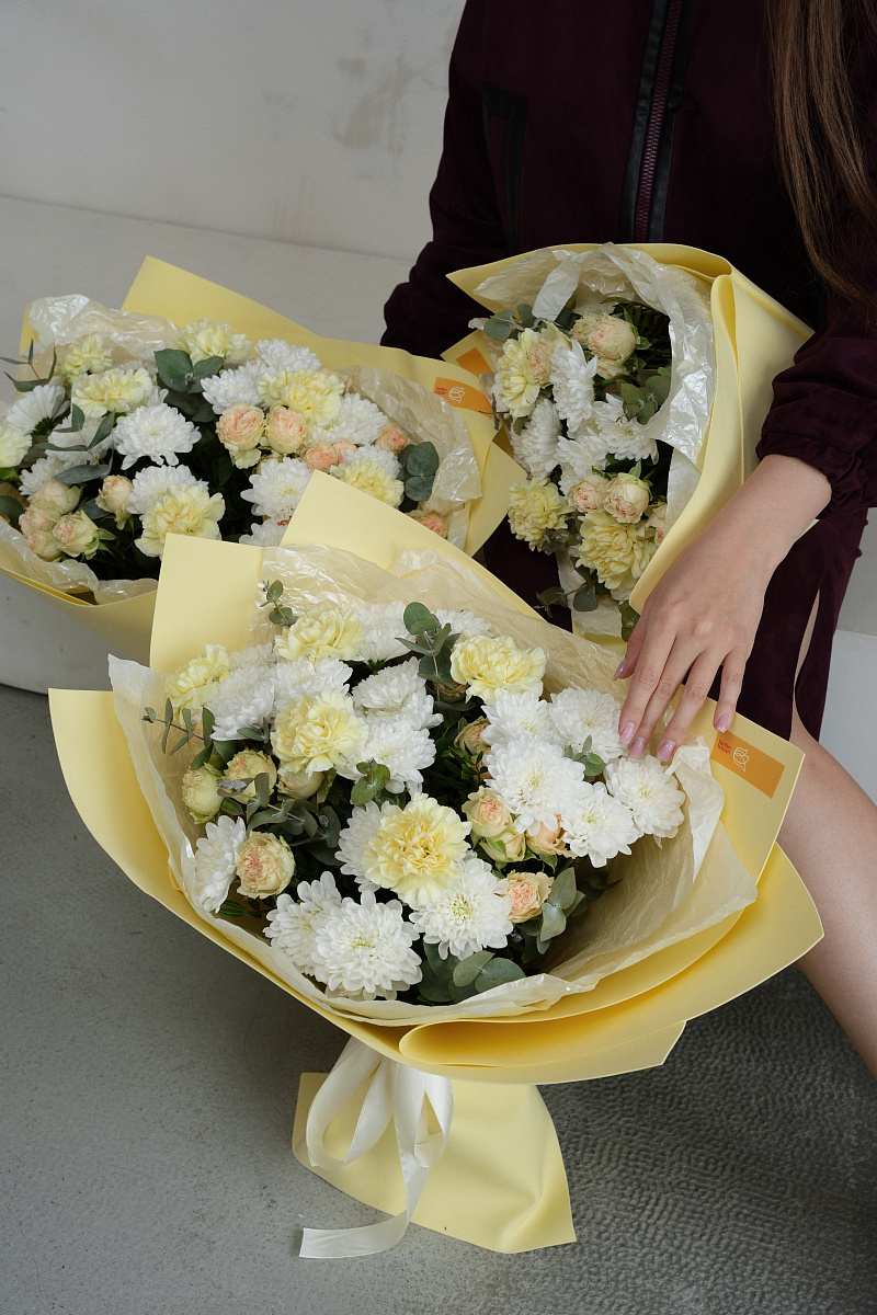 Цветочное сочетание хризантем и лимонных гвоздик в коллекции "Лунный мёд" является ярким примером естественной красоты и оригинальности. Этот букет объединяет мягкое очарование осенних красок и яркость цитрусовых оттенков, превращаясь в истинное произведение искусства среди букетов.