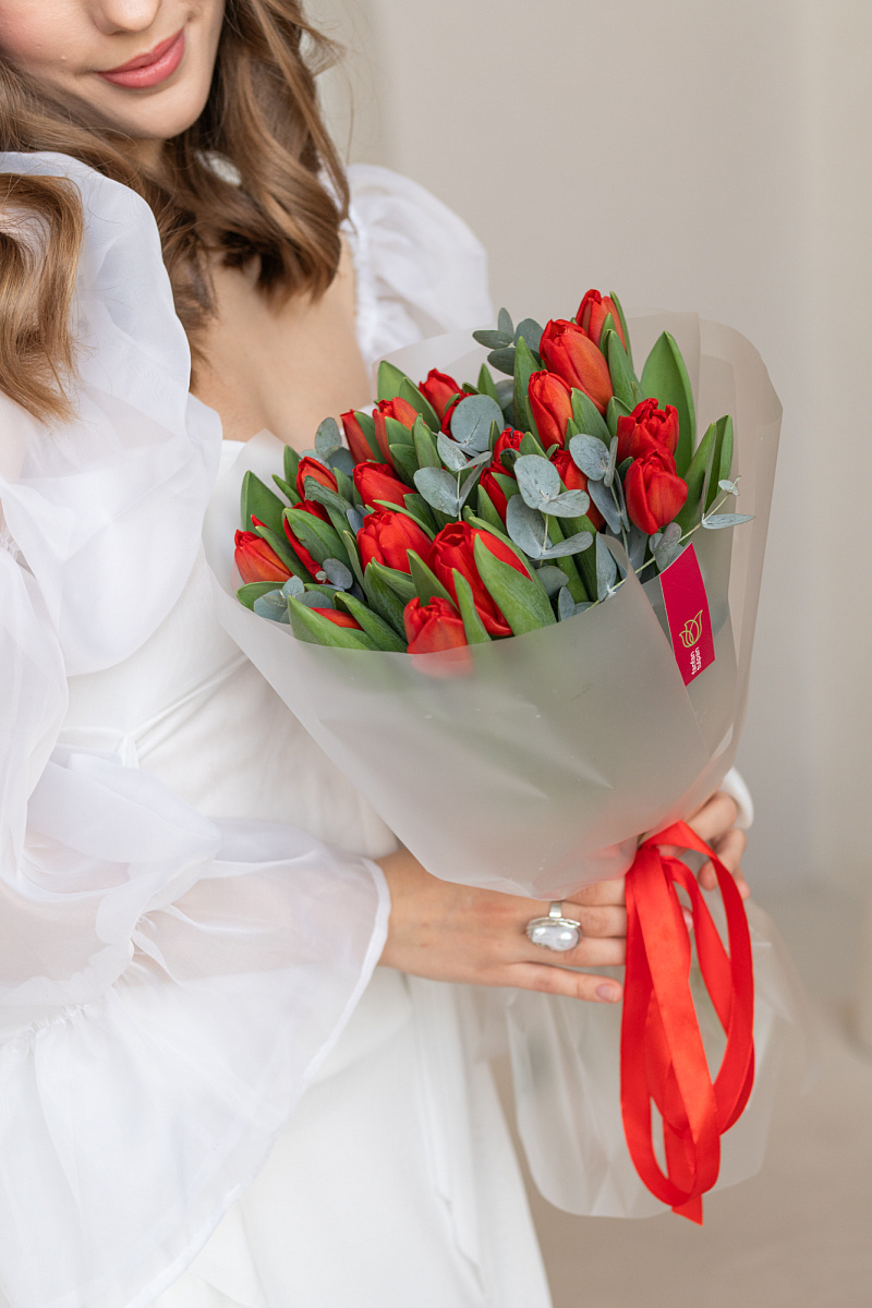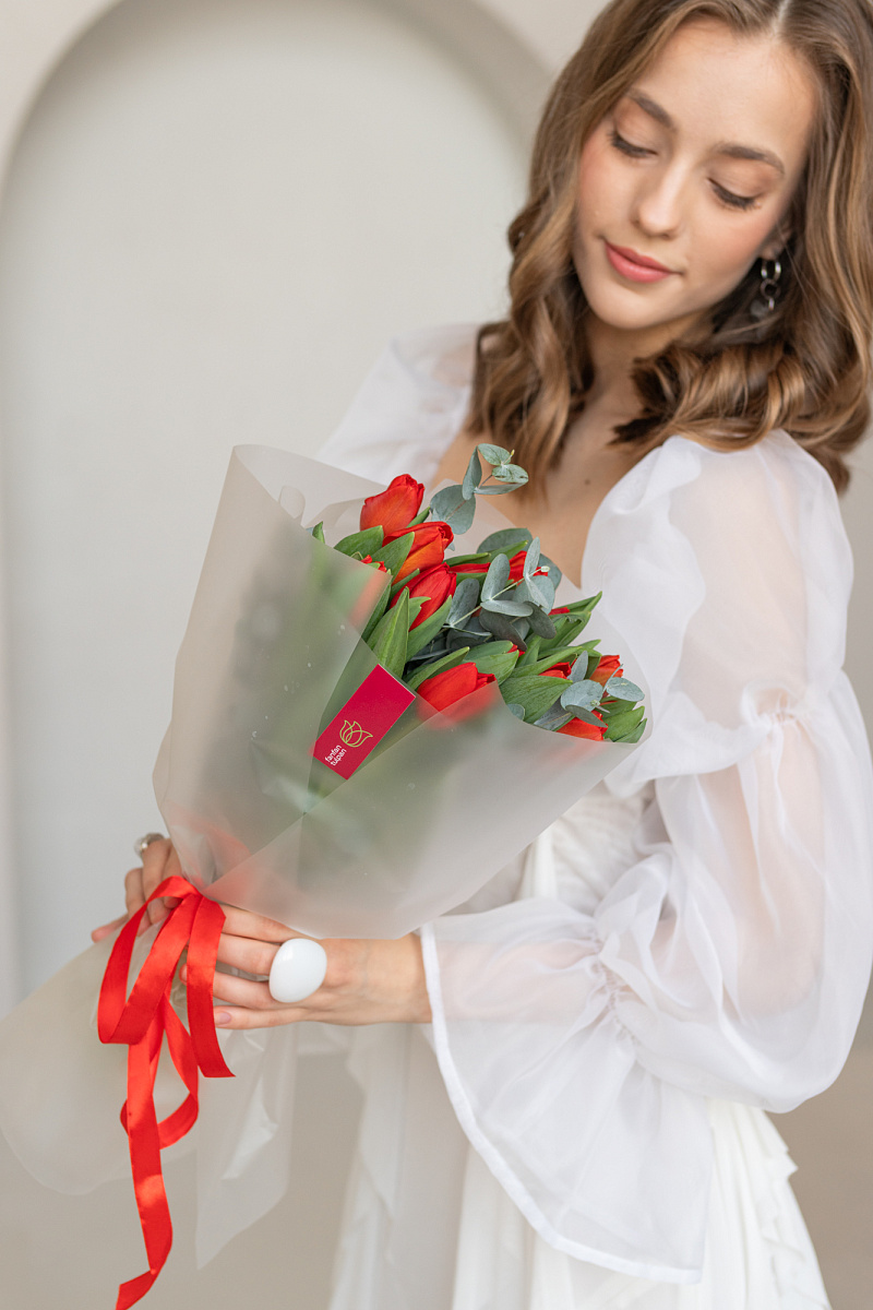Модная комбинация: яркие красные тюльпаны и лаконичный эвкалипт. Минималистичная геометрия бутонов и мягкая фактура зелени создают актуальный визуальный дуэт. Такой букет станет выразительным акцентом в современном пространстве или стильным знаком внимания без лишних слов.