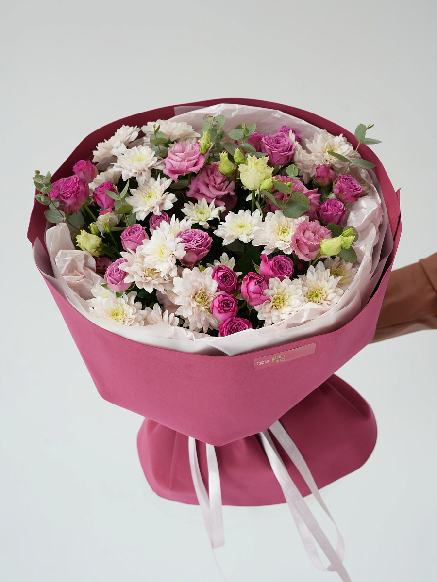 Сборный букет в розово-бордовом цвете — прекрасное сочетание нежности и глубины. Такие оттенки подчеркивают чувственность и тепло чувств.