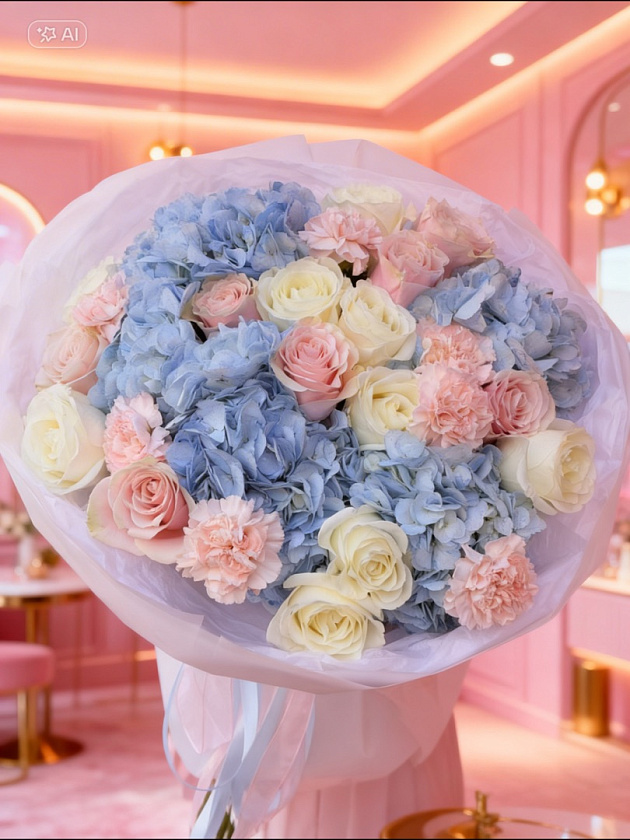 Пышный букет с голубыми гортензиями