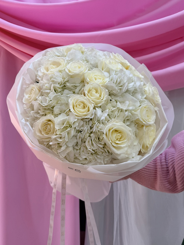 Белоснежный букет с гортензиями и розами