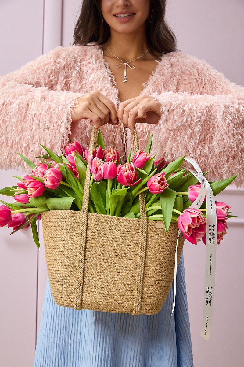Композиция выглядит свежо и жизнерадостно, идеально подойдёт для весеннего декора, подарка или украшения интерьера. Сочетание натурального кашпо и ярких тюльпанов создаёт гармоничный и стильный акцент.