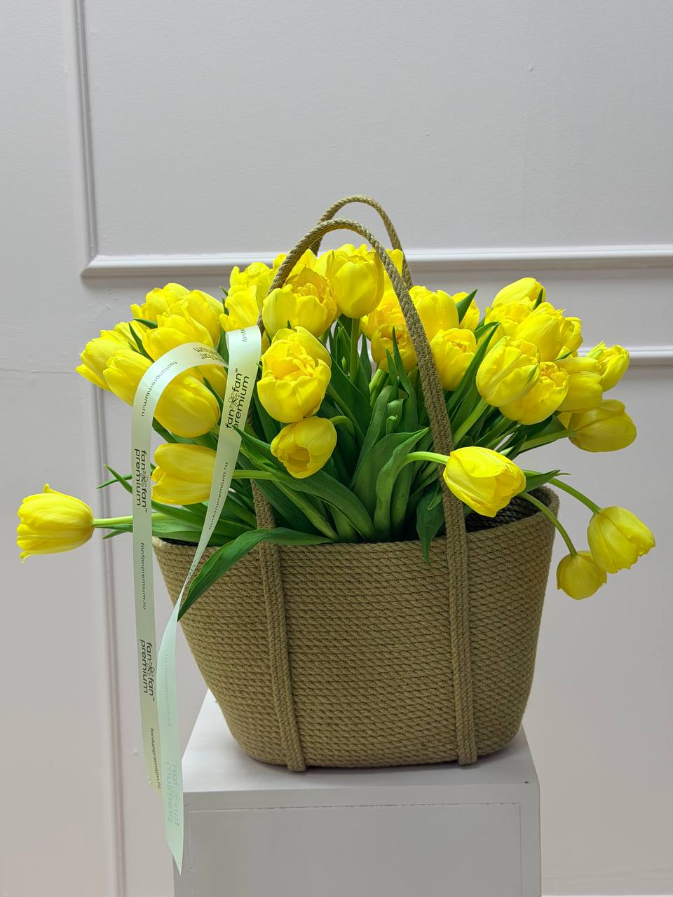 Композиция выглядит свежо и жизнерадостно, идеально подойдёт для весеннего декора, подарка или украшения интерьера. Сочетание натурального кашпо и ярких тюльпанов создаёт гармоничный и стильный акцент.