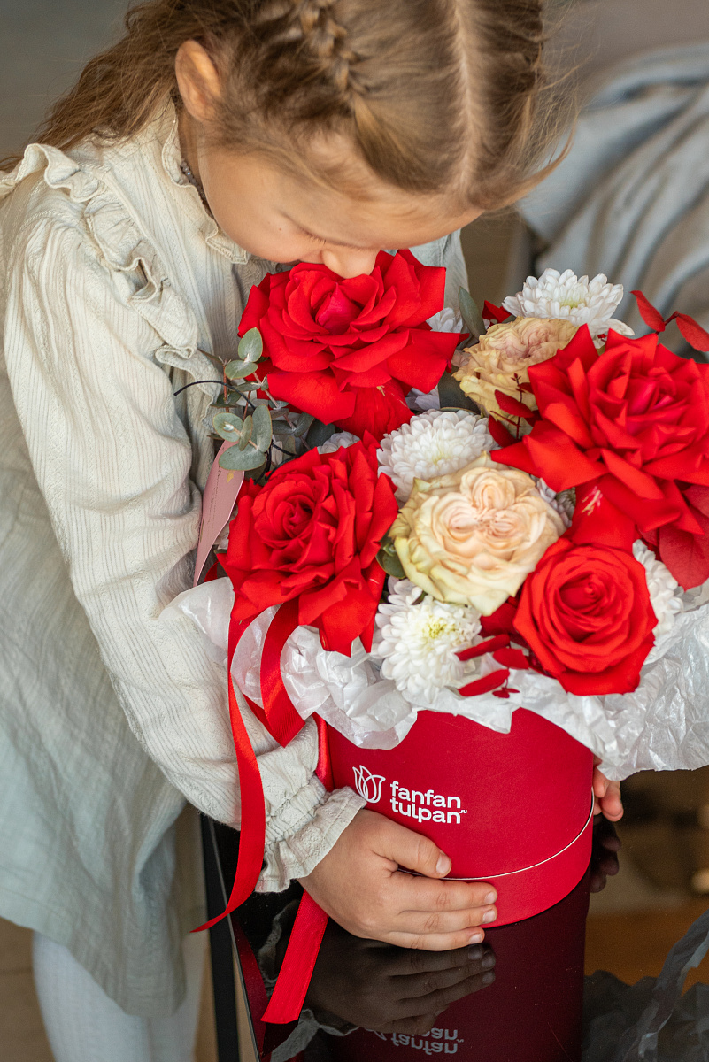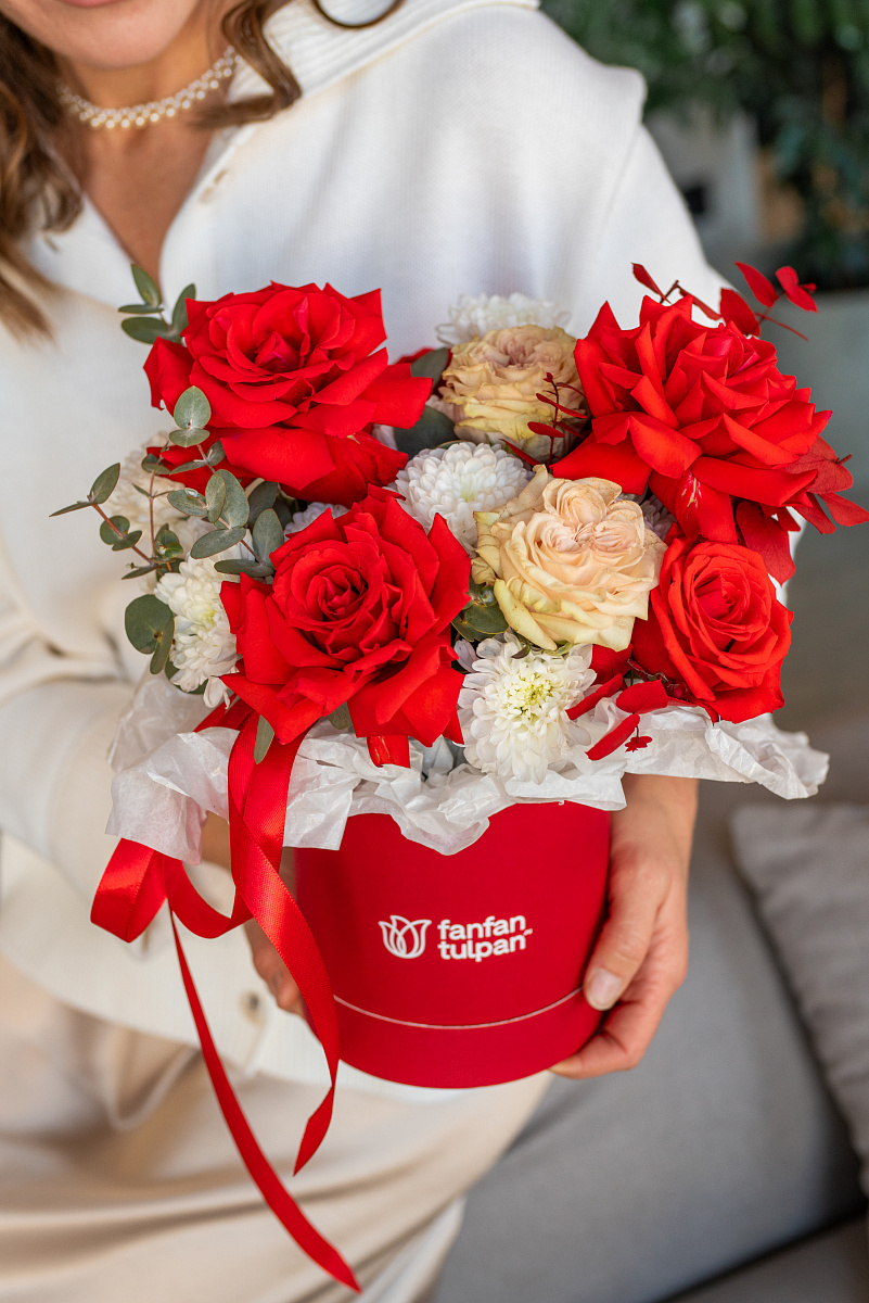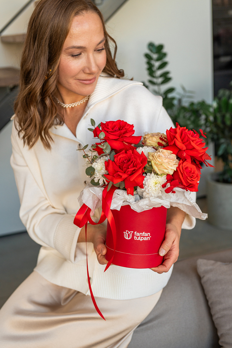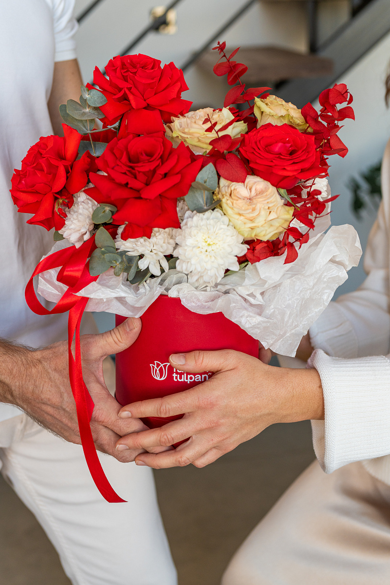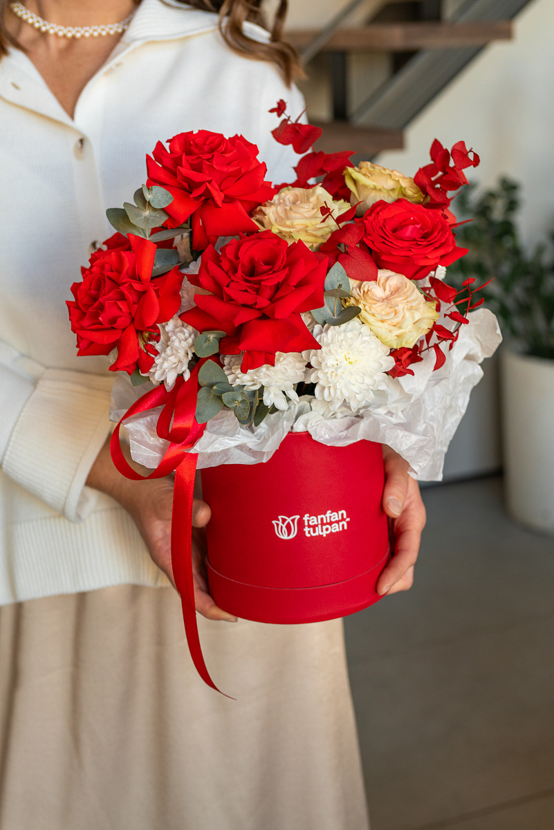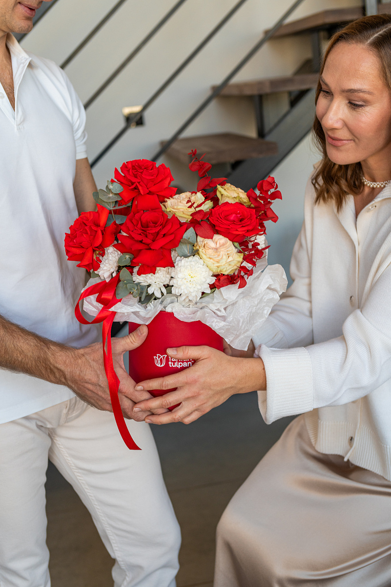 Элегантная композиция в стильной коробке — это современный флористический шедевр, где гармония форм, оттенков и текстур создаёт неповторимое впечатление.
