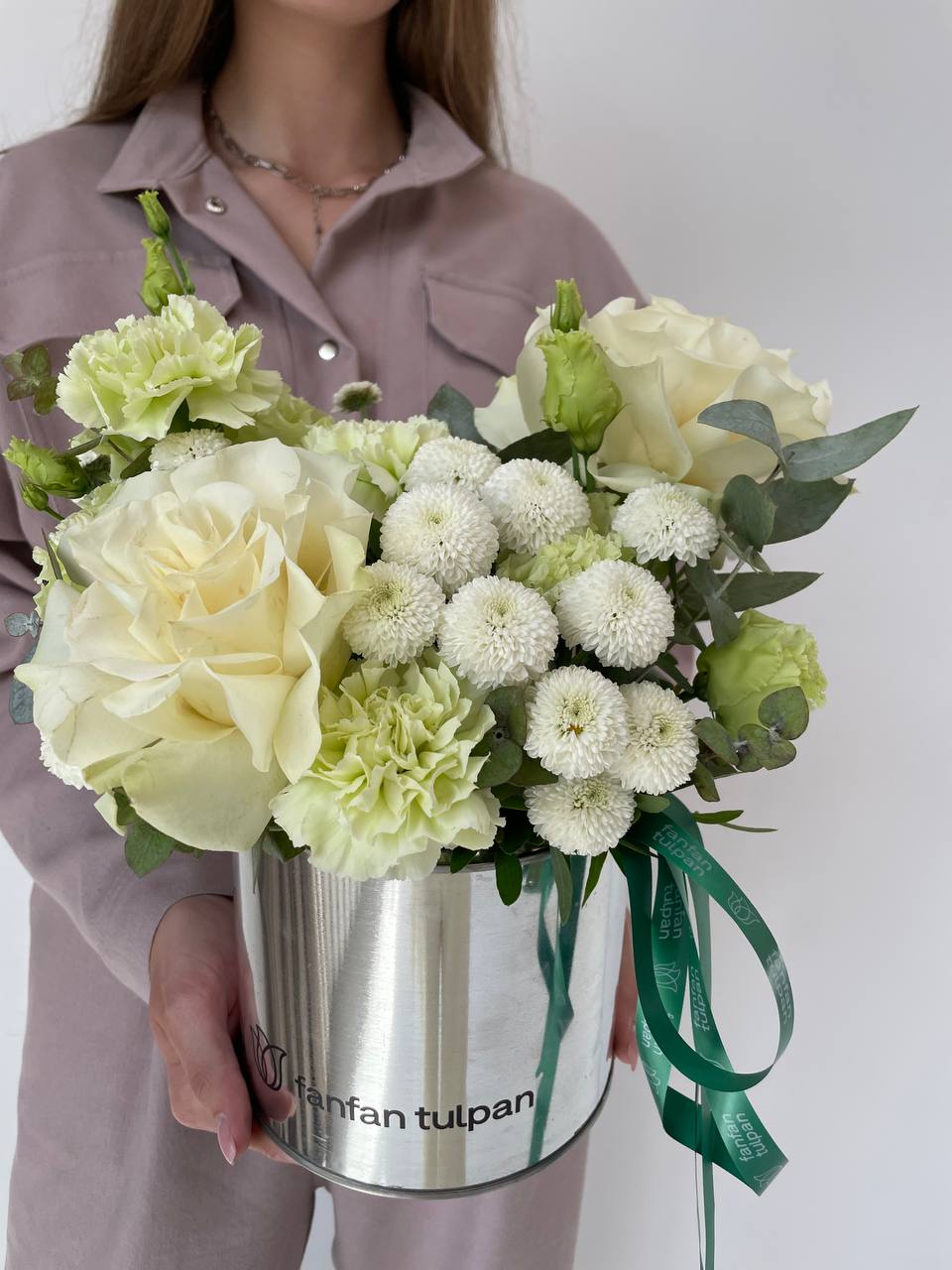 Цветочная композиция из роскошных роз и лаймовых гвоздик представляет собой удивительное сочетание элегантности и природной красоты.