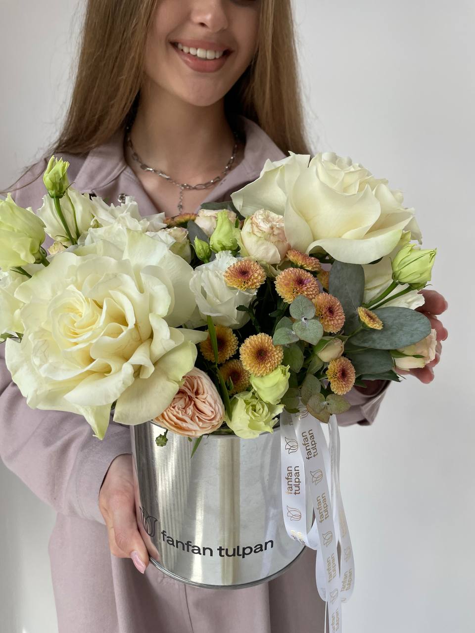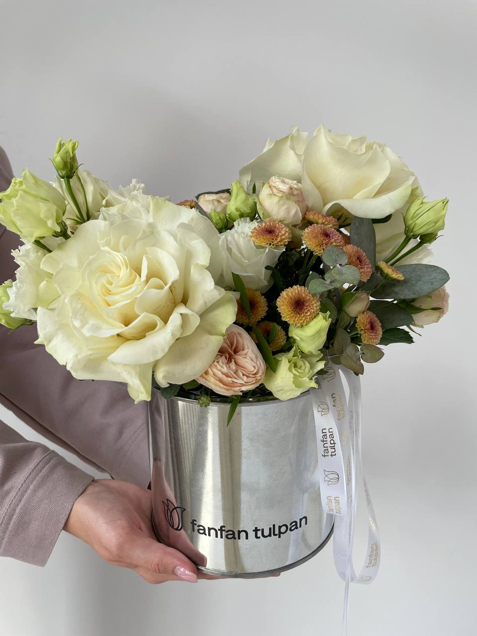 Изящная цветочная композиция с белоснежными розами и нежными кремовыми сантини воплощает в себе тонкую игру света и тени, отражающую всю прелесть осенней поры.