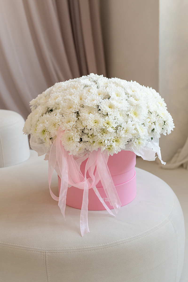 «Большая история» — это не просто букет в коробке, а целое повествование, выраженное языком цветов. Пышная композиция из хризантем рассказывает о глубине чувств, стойкости намерений и красоте, которая длится долго — как хорошая история, не теряющая очарования со временем.