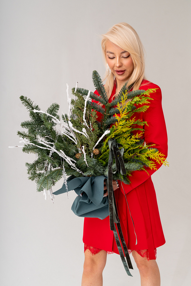 Новогодний букет из нобилиса и туи — это стильное и ароматное украшение, которое создаёт атмосферу праздника. Такие композиции сочетают в себе благородную хвою нобилиса и плотную структуру туи, дополненные декоративными элементами.