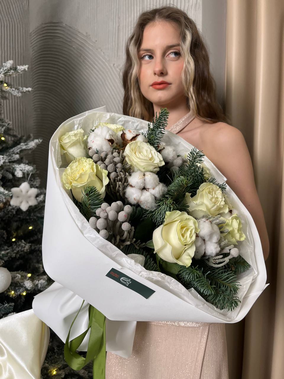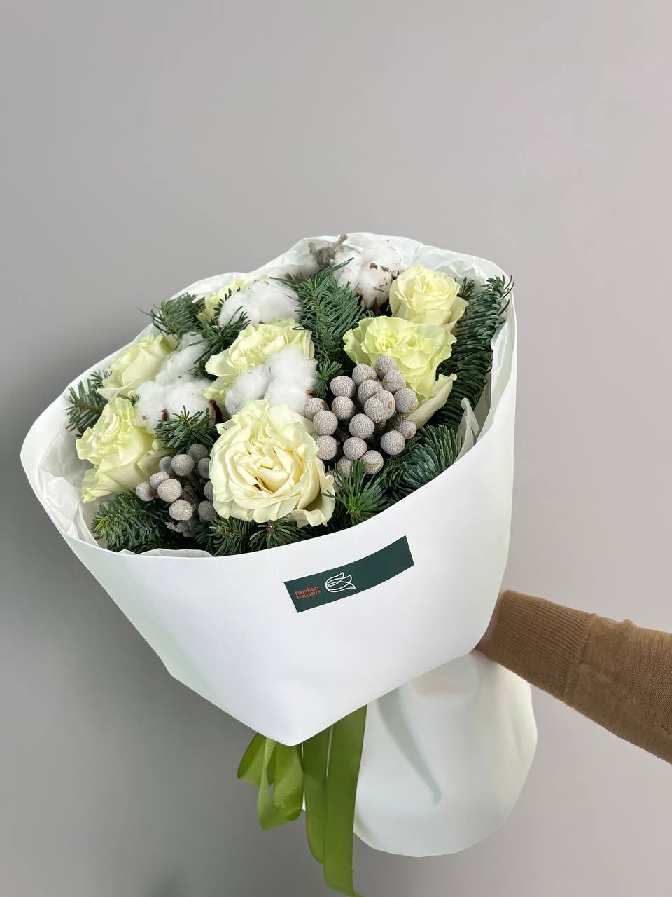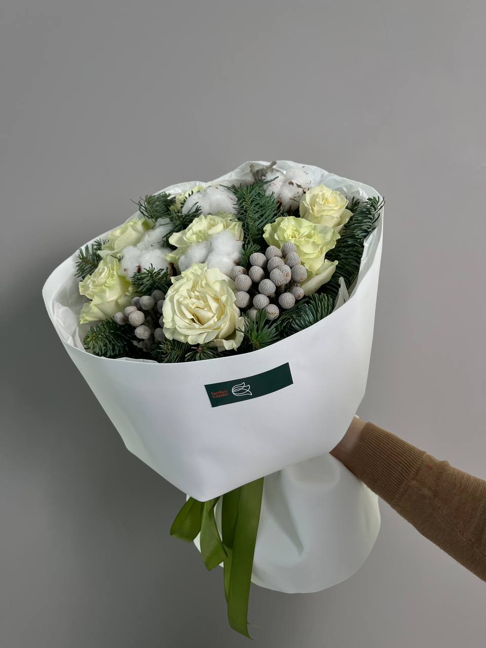Новогодний букет из нобилиса, роз и хлопка — это стильное и ароматное украшение, которое создаёт атмосферу праздника. Такие композиции сочетают в себе благородную хвою нобилиса и мягкие коробочки хлопка, дополненные декоративными элементами.