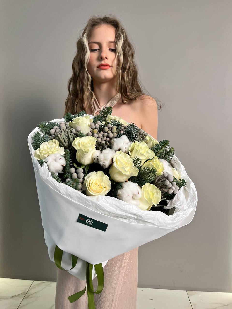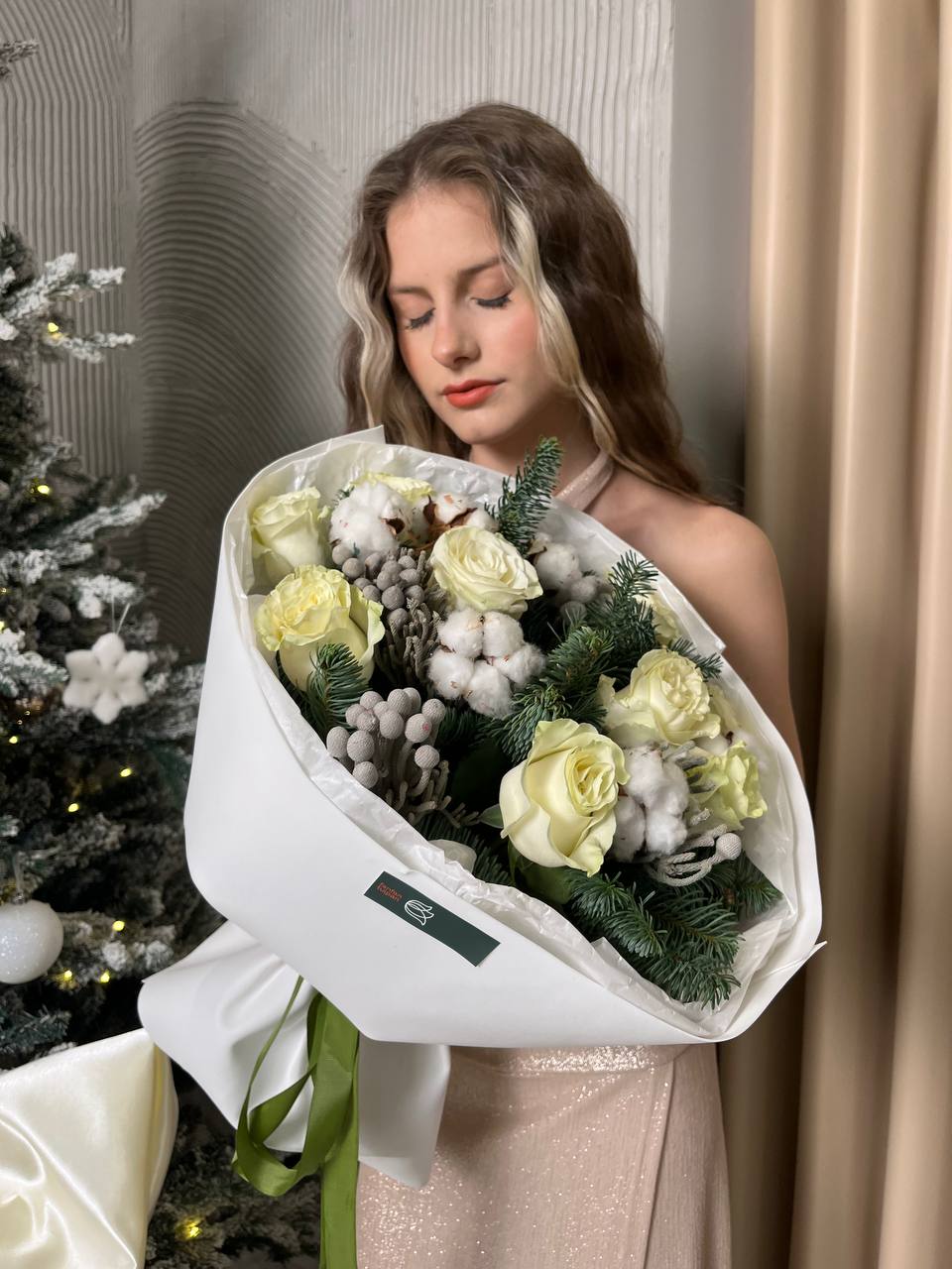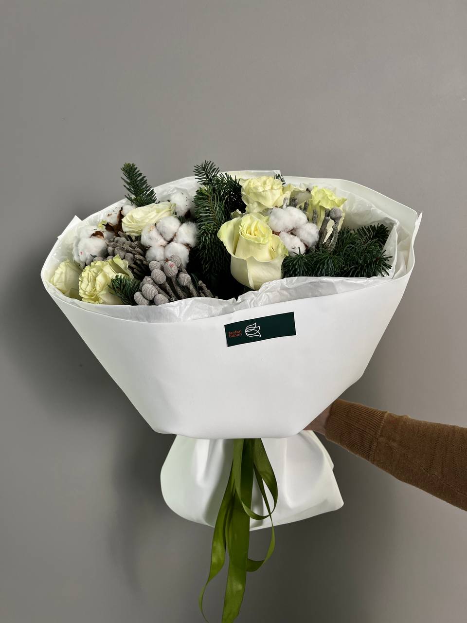 Новогодний букет из нобилиса, роз и хлопка — это стильное и ароматное украшение, которое создаёт атмосферу праздника. Такие композиции сочетают в себе благородную хвою нобилиса и мягкие коробочки хлопка, дополненные декоративными элементами.