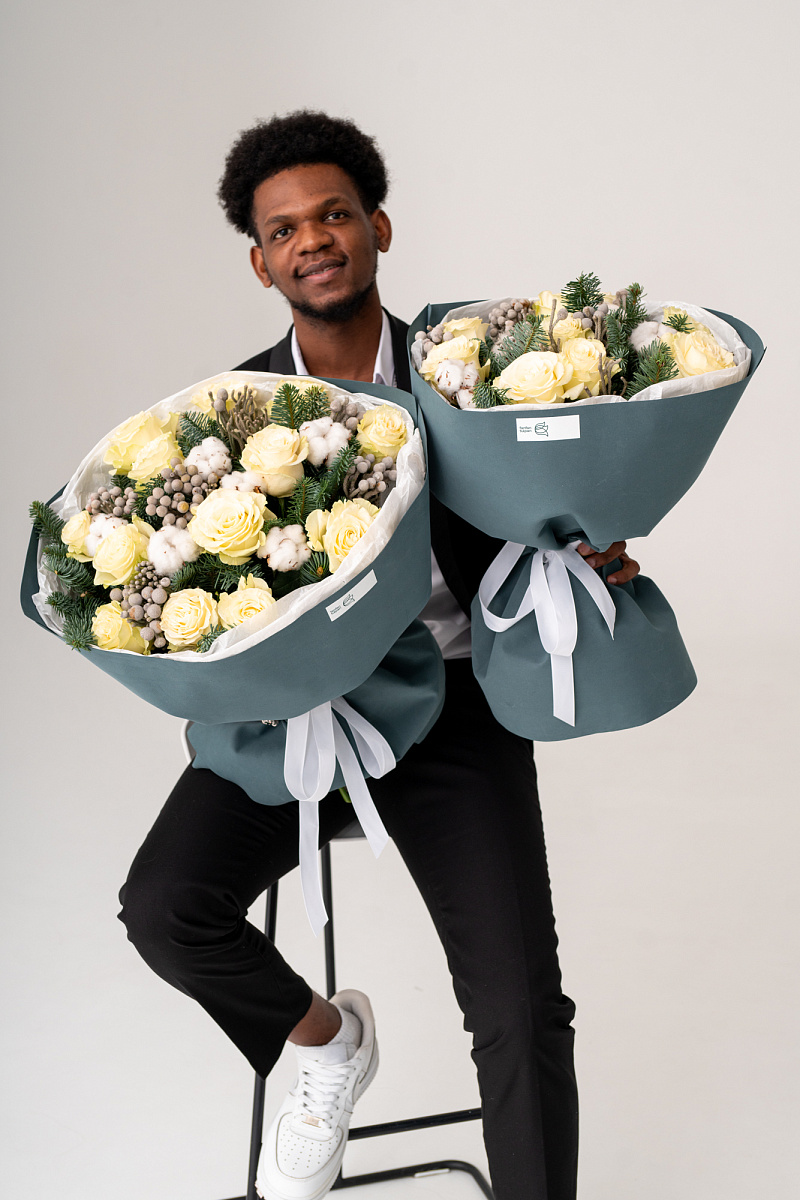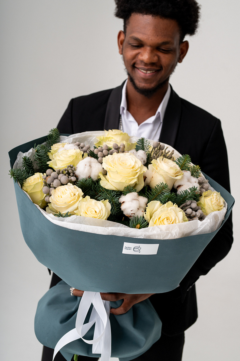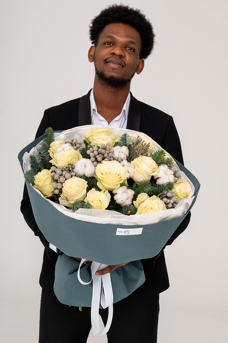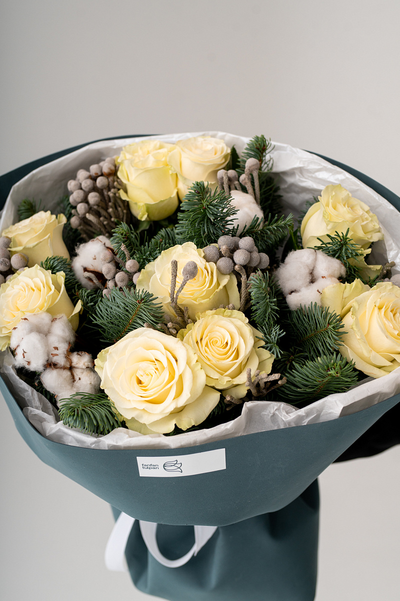 Новогодний букет из нобилиса, роз и хлопка — это стильное и ароматное украшение, которое создаёт атмосферу праздника. Такие композиции сочетают в себе благородную хвою нобилиса и мягкие коробочки хлопка, дополненные декоративными элементами.