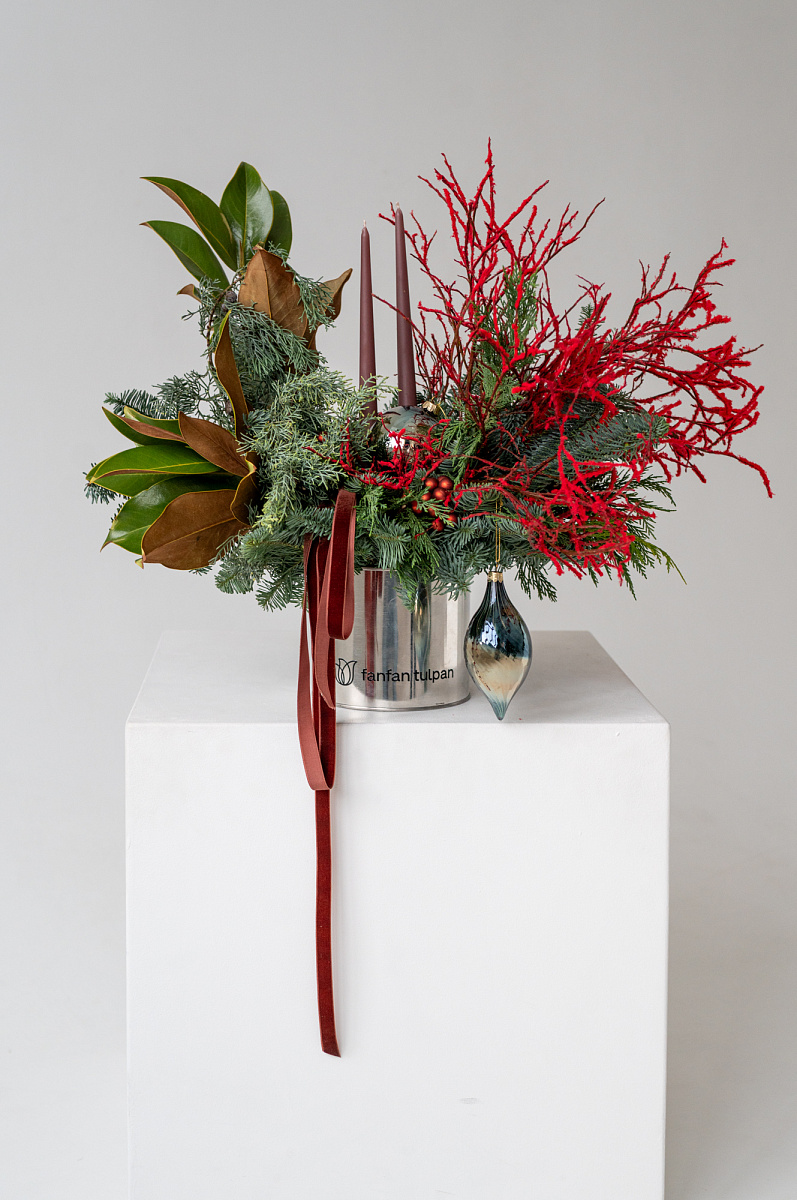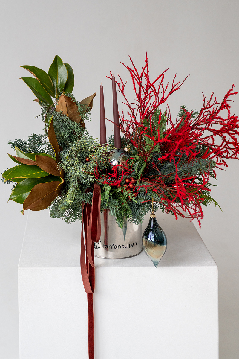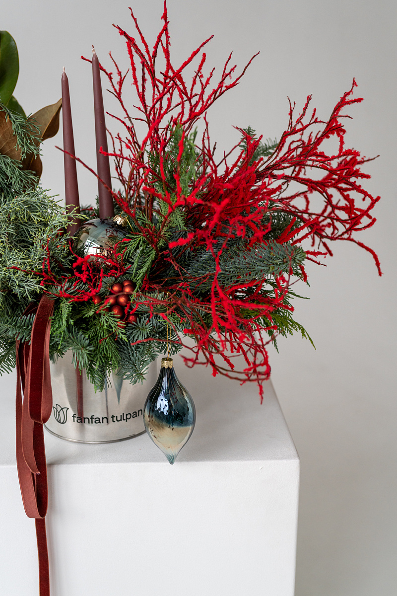 Центральный акцент — роскошные ветви нобилиса с их характерной серебристо-зеленой хвоей, создающие объемную и пышную структуру. Мягкие пушистые веточки туи дополняют композицию, добавляя текстуру и глубину.