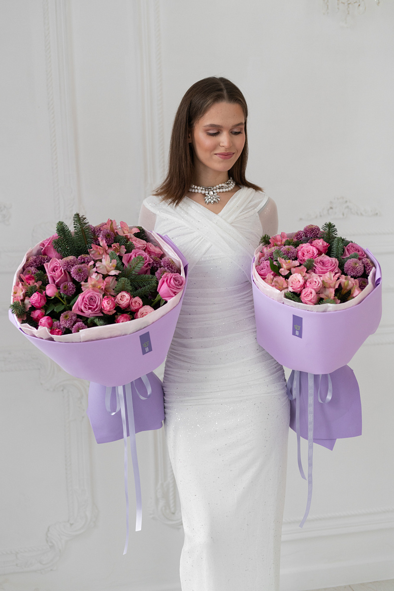 Сиреневые цветы, благодаря своей нежной лавандовой окраске, придают букету особый шарм и романтичность.